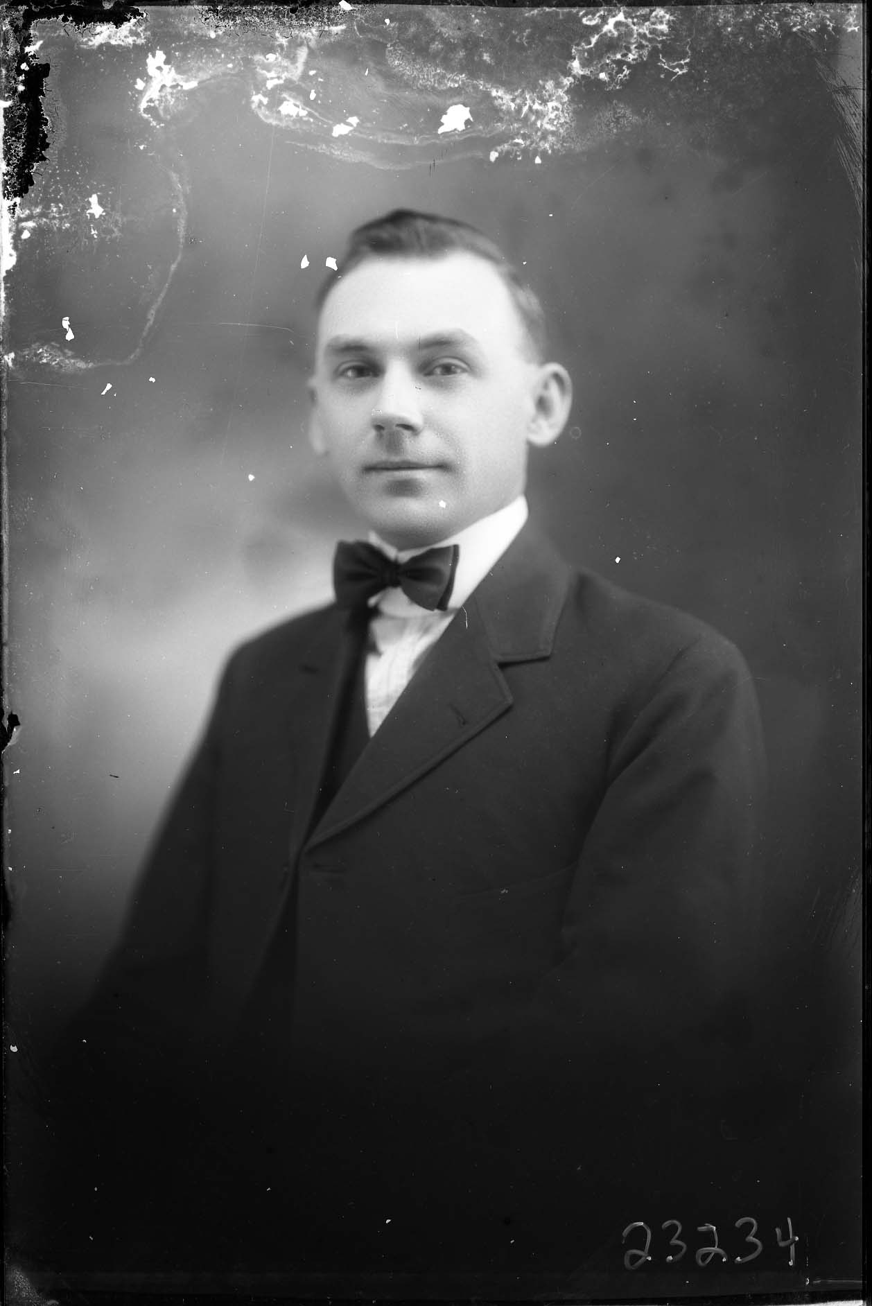 Portrait photograph of an unidentified man wearing a suit and bow tie with a starched collar.