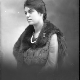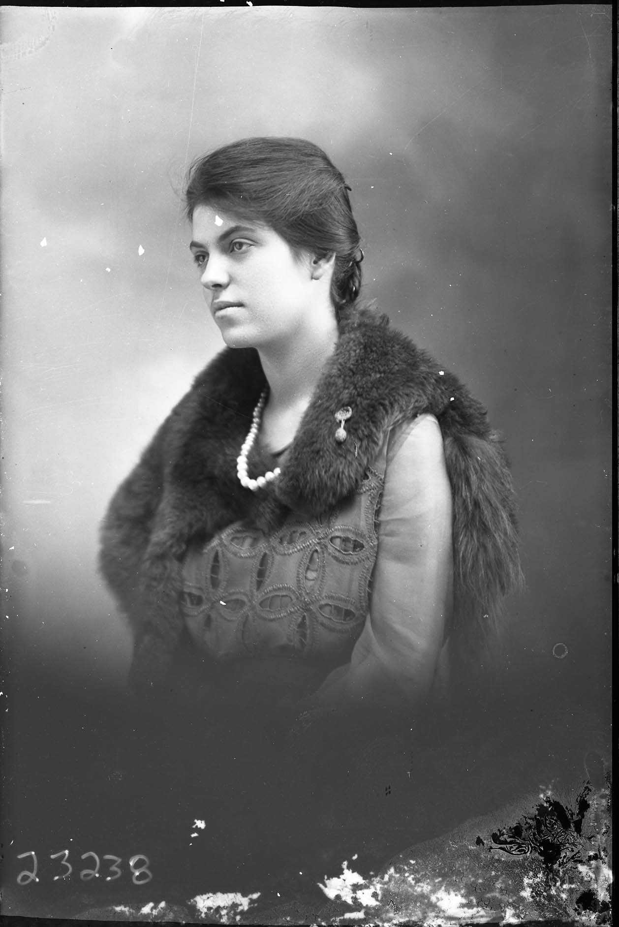 Portrait photograph of an unidentified woman wearing a fur stole and beads is shown looking to the side, almost in profile.