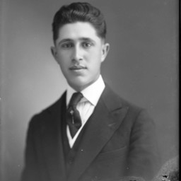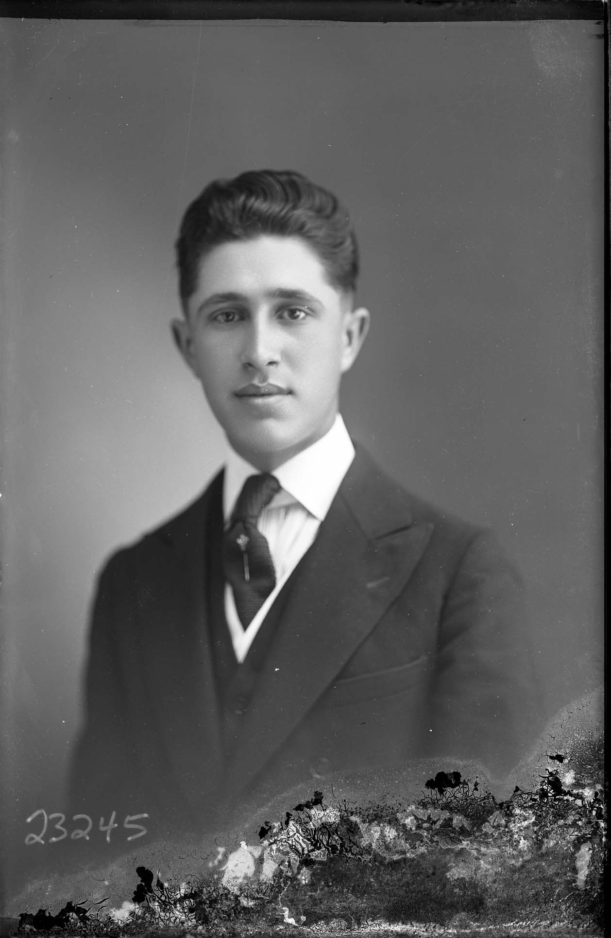 Portrait photograph of an unidentified young man wearing a suit and tie with a starched collar.