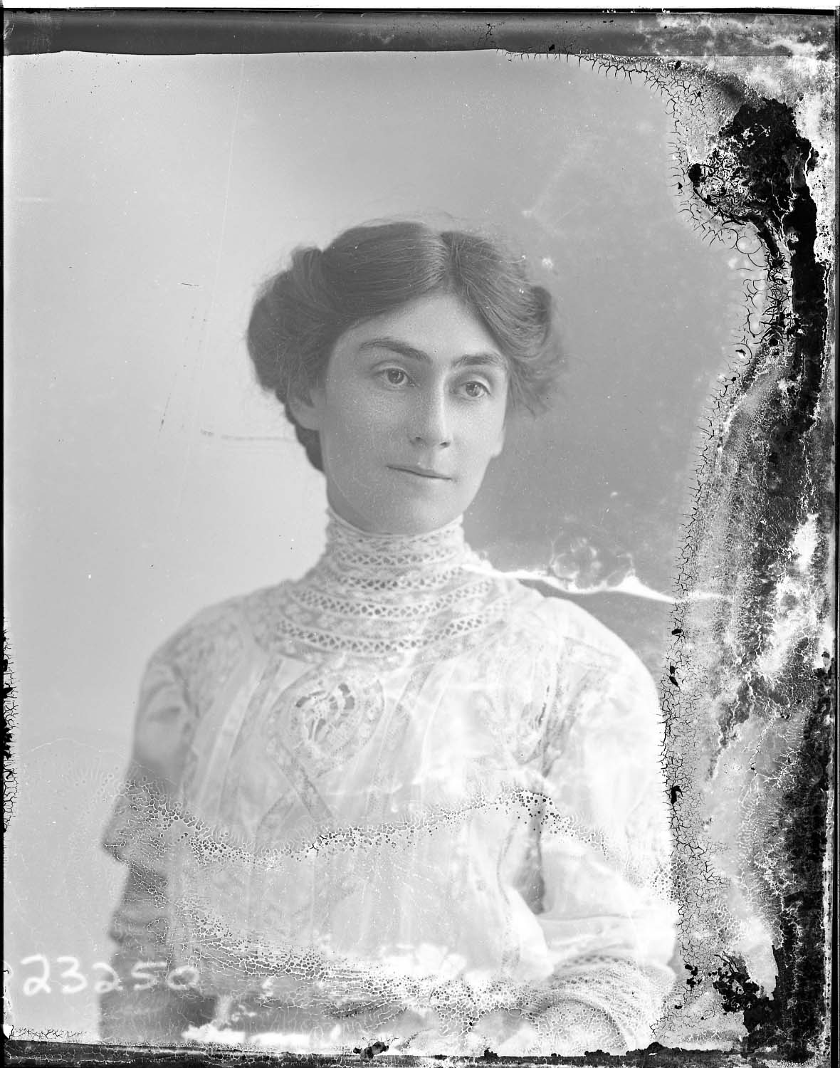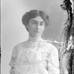 Portrait photograph of an unidentified woman with her hair pulled back and parted in the middle. She is wearing a dress with a high lace collar.
