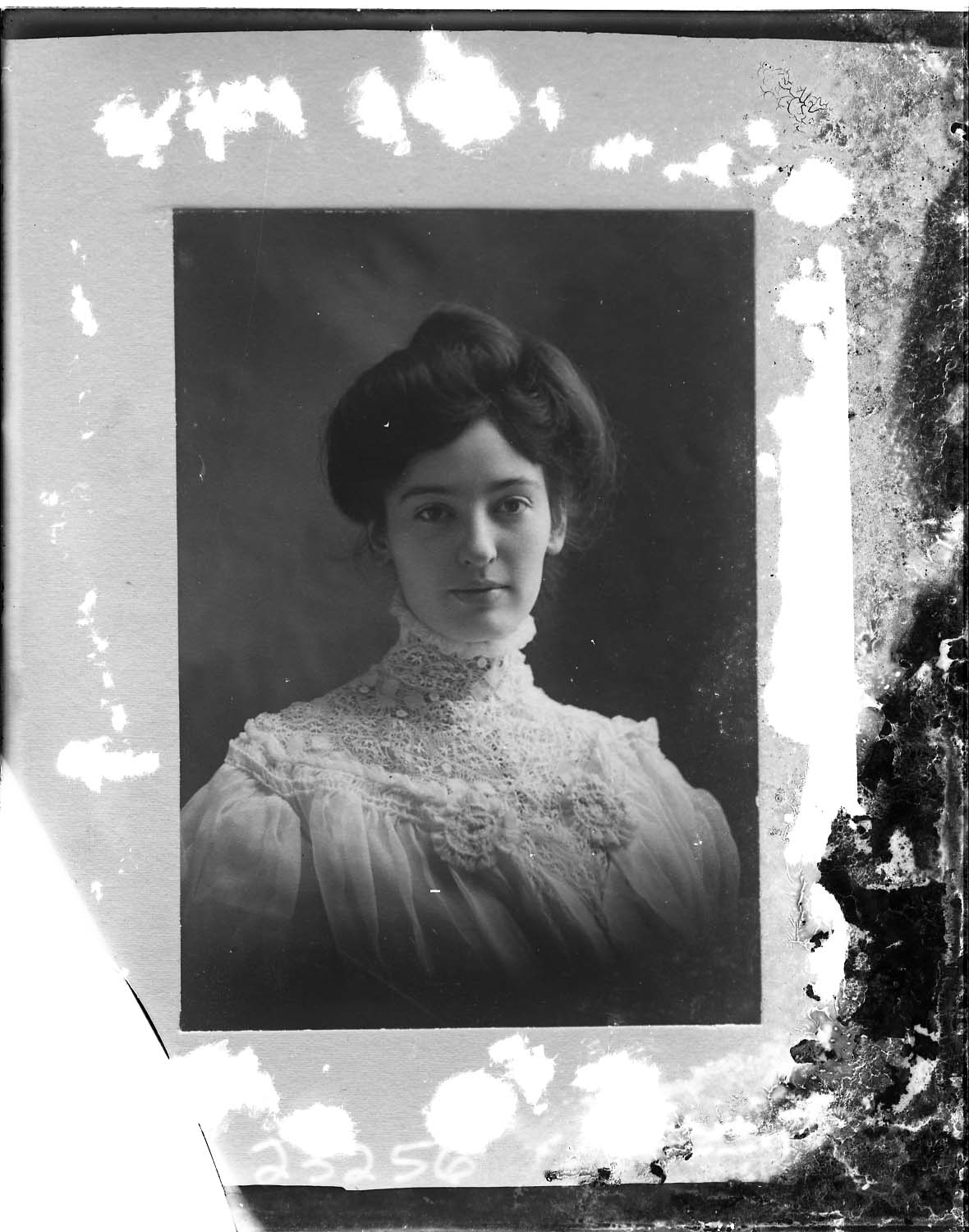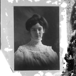 Photo of a portrait photograph of an unidentified woman with her hair pulled up and wearing a high collar with lace trim on it.