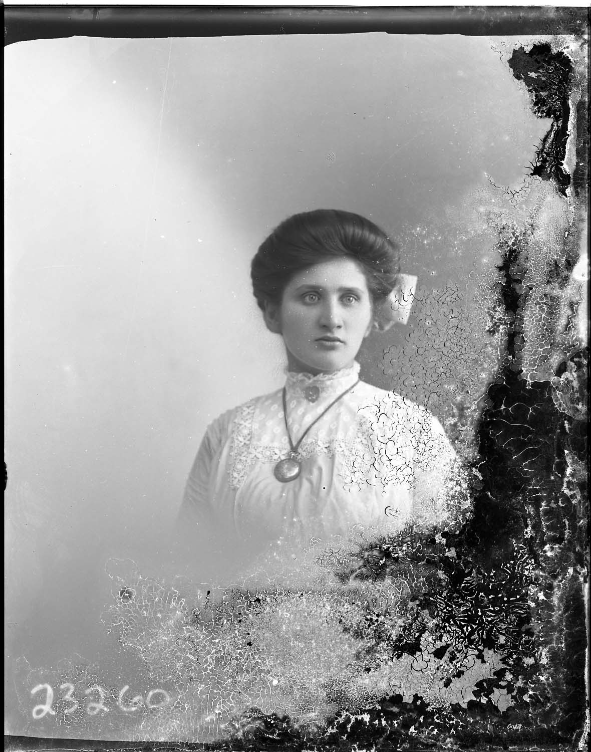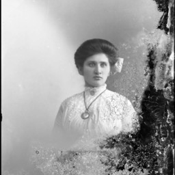 Portrait photograph of an unidentified woman wearing her hair pulled back with a bow in it and a long locket or watch around her neck.