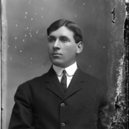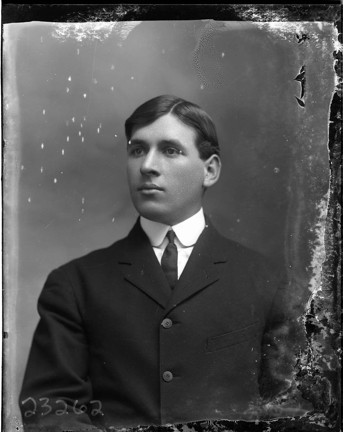 Portrait photograph of an unidentified young man wearing a suit and tie with a starched collar.