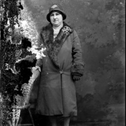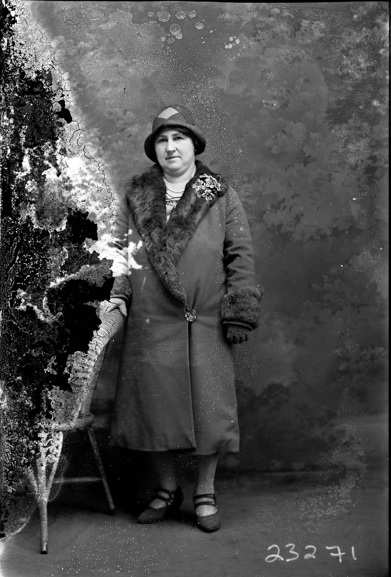 Damaged image of an unidentified woman standing with her arms at her sides and wearing a hat and a corsage pinned to the fur collar of her coat.