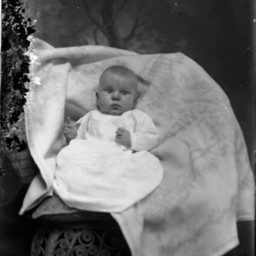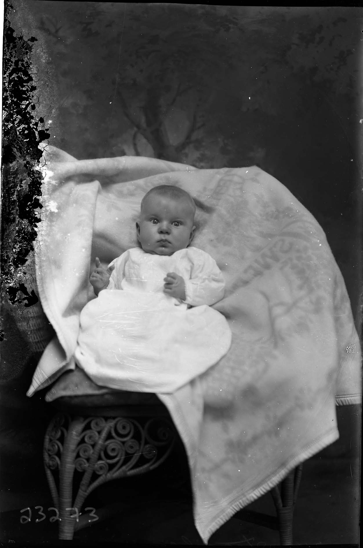 Unidentified baby is posed on a covered wicker chair.
