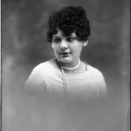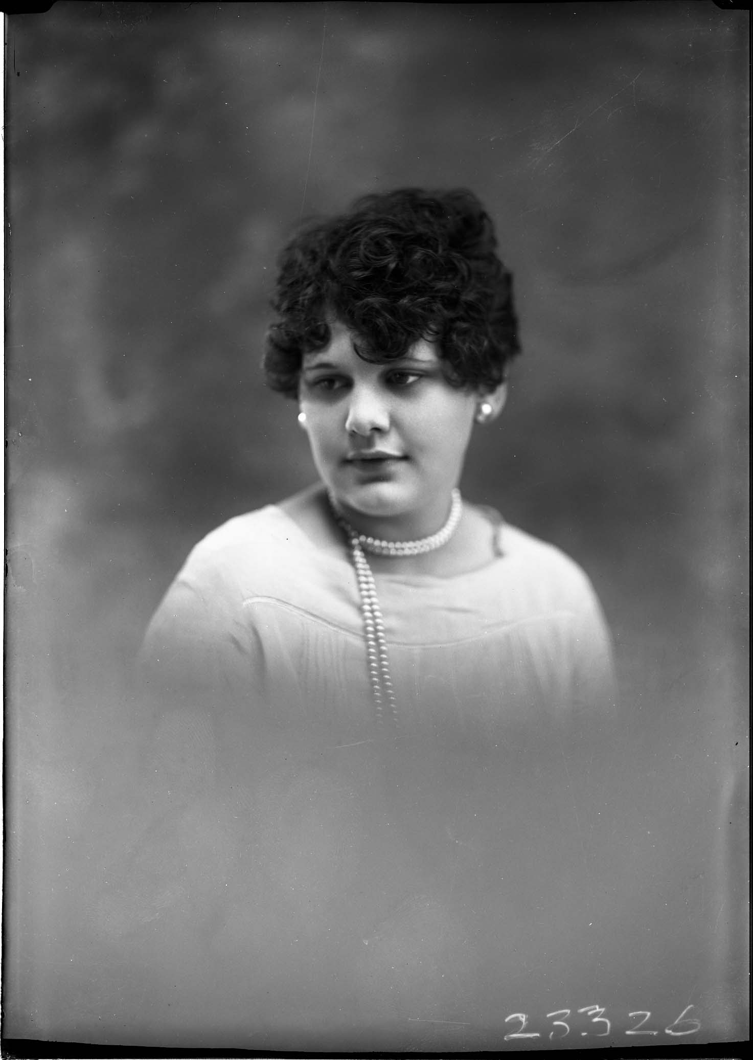Portrait photograph of an unidentified woman with short hair and wearing earrings and a bead necklace with her dress.