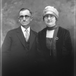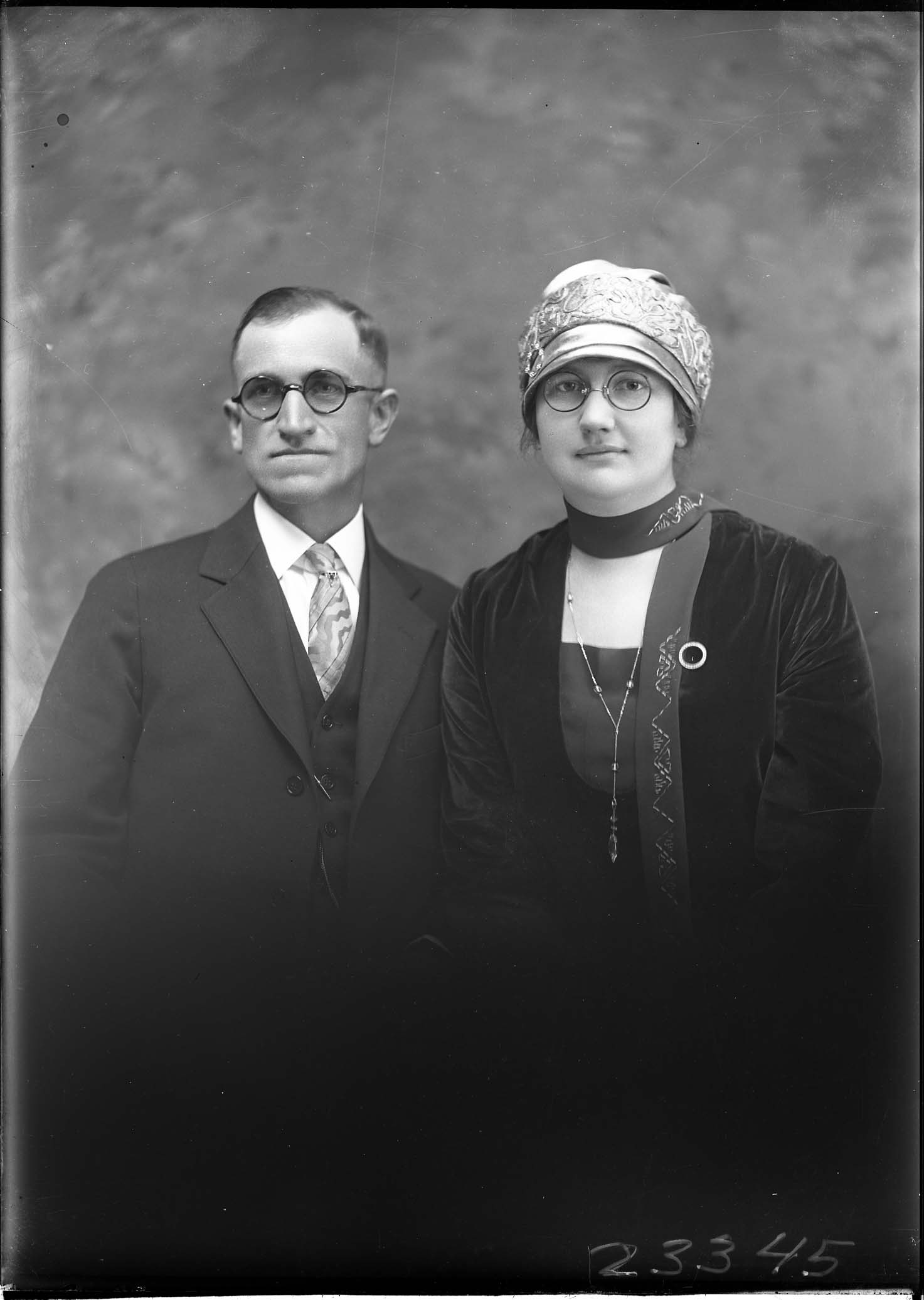 Unidentified man in a suit is posed beside an unidentified woman in a hat and wearing a necklace and pin on her dress.
