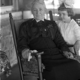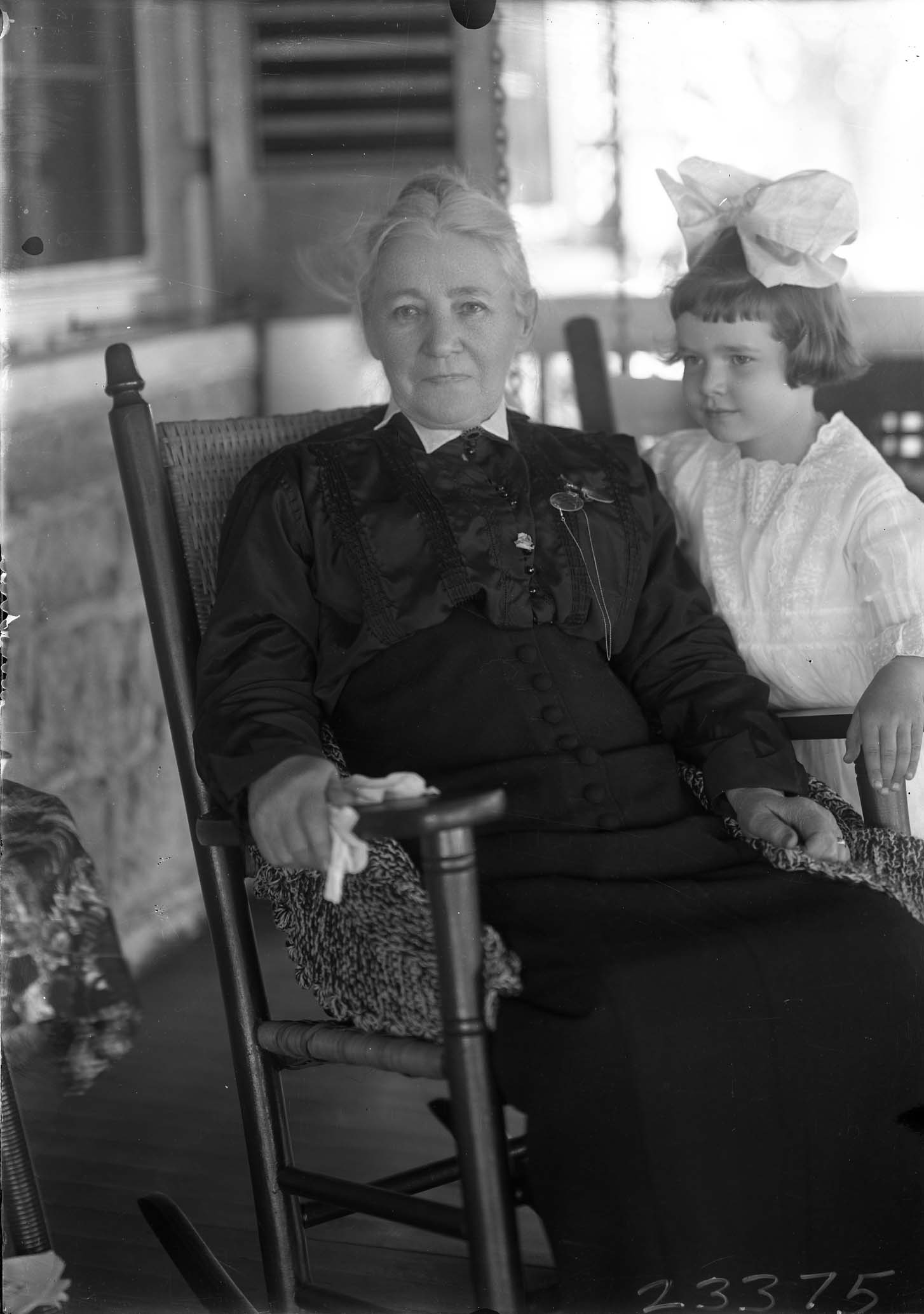 Unidentified woman wearing a pair of pince-nez glasses pinned to her dress, is seated outdoors on a rocker with an unidentified young girl with a bow in her hair standing beside her.
