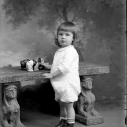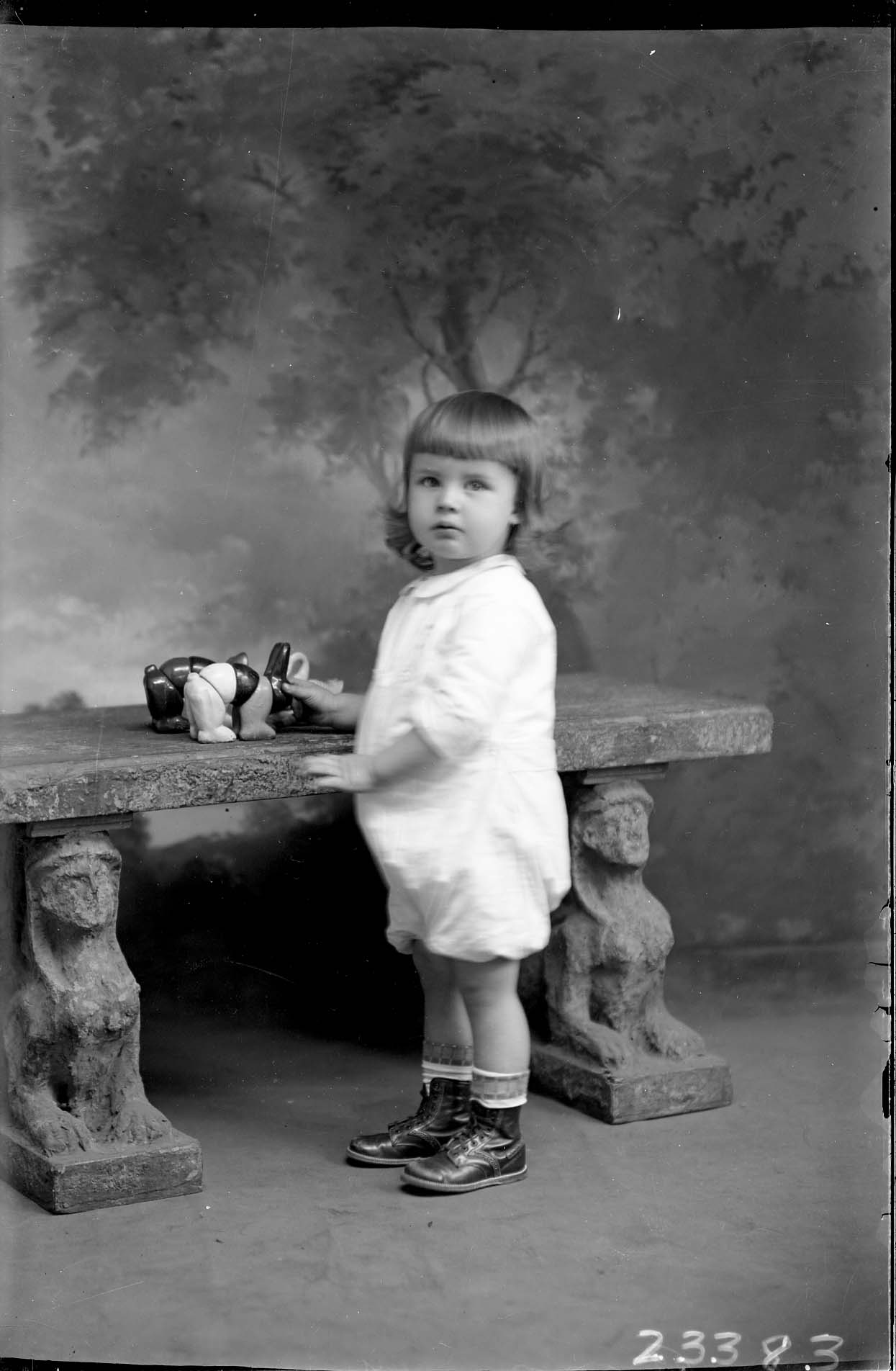 Unidentified young child with bangs is standing by a stone bench and toys.