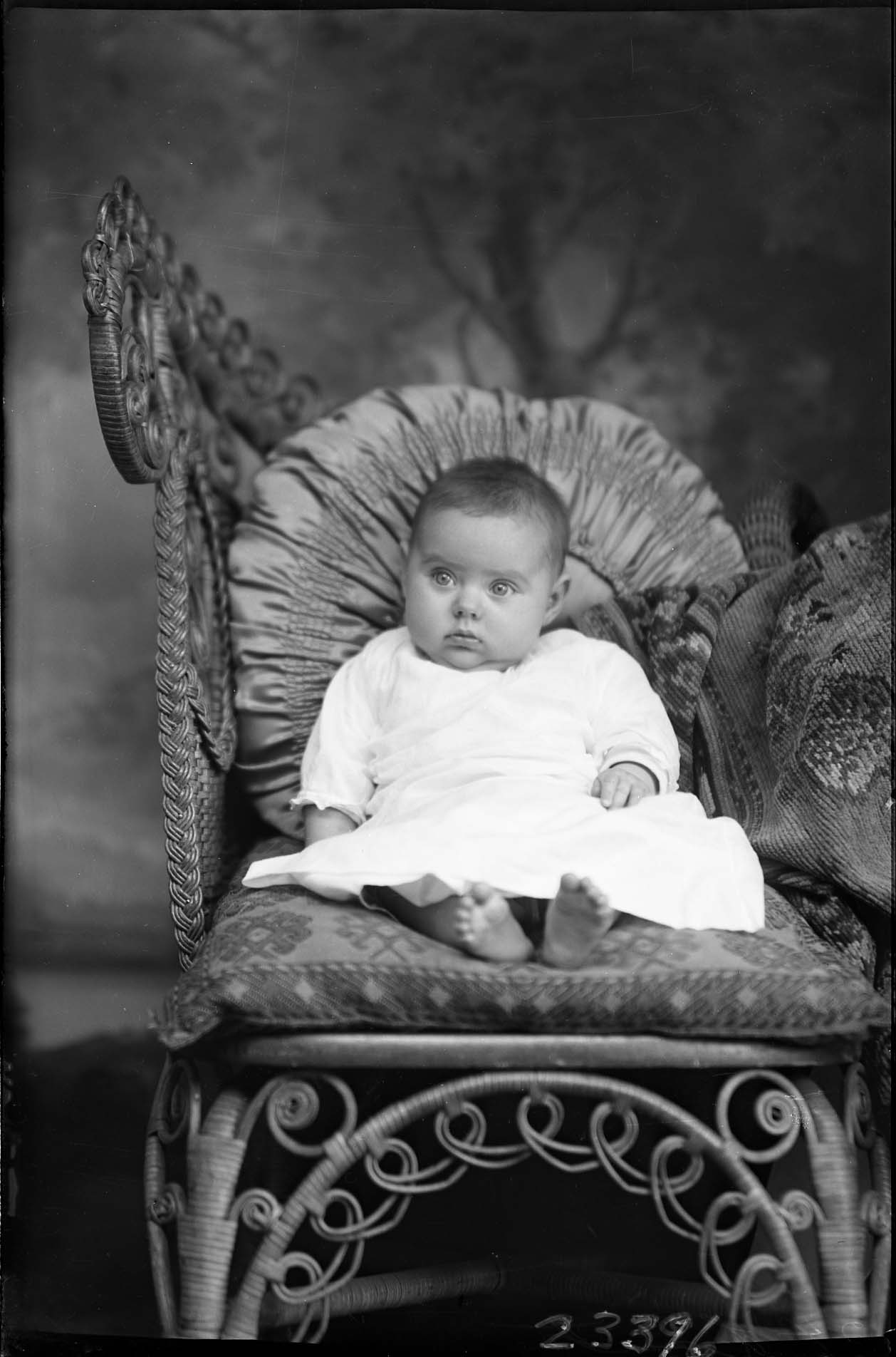 Unidentified barefoot baby is propped against pillows on a wicker chair.
