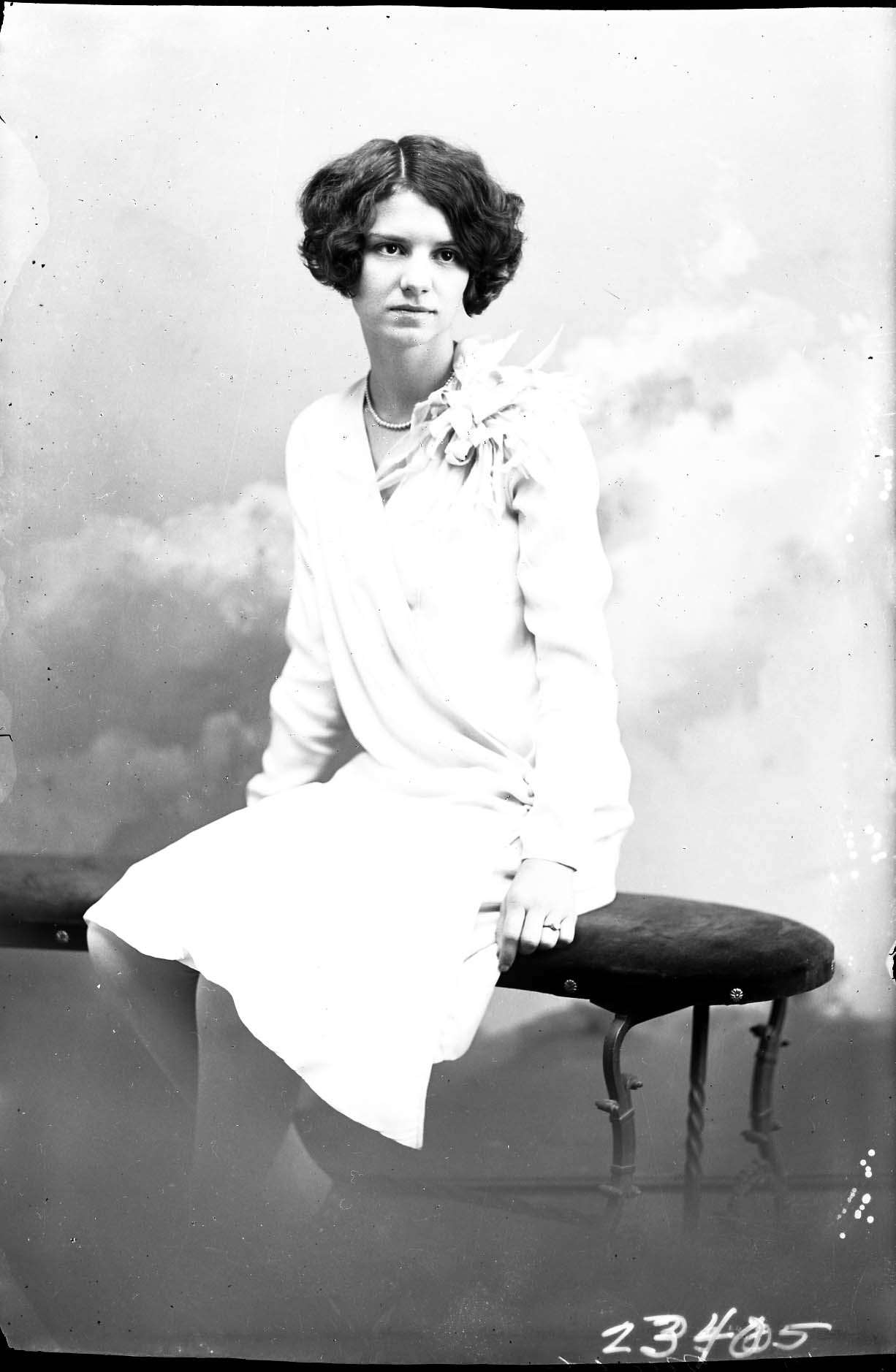 Unidentified woman with short hair and wearing a corsage and necklace, is sitting on a bench.