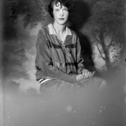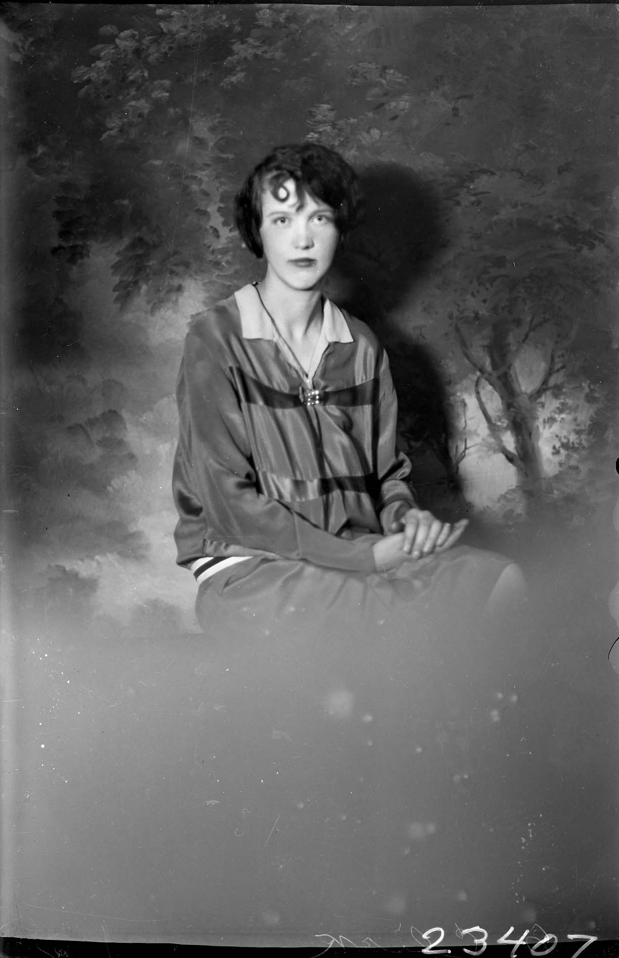 Unidentified young woman with a single curl on her forehead and short hair is seated with her hands in her lap.