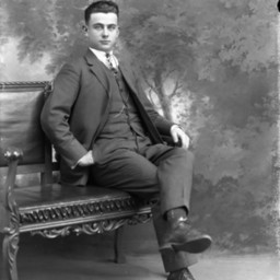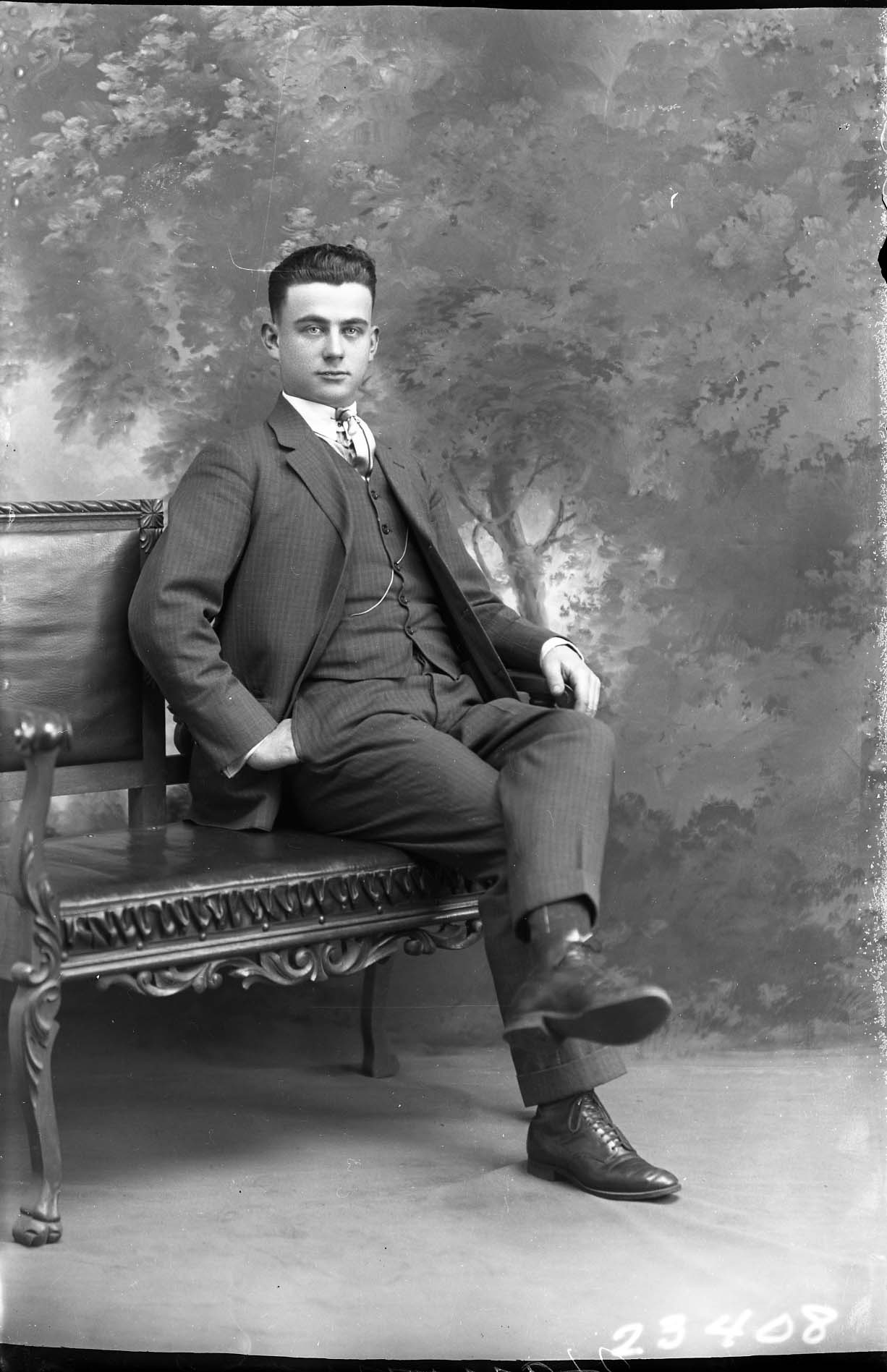 Unidentified man in a suit and tie is seated on a bench with one hand in his pants pocket and his legs crossed.