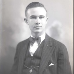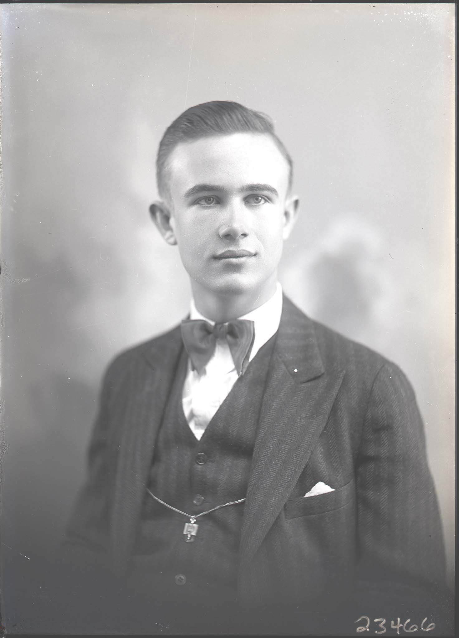 Portrait photograph of an unidentified young man wearing a striped suit and bow tie. A handkerchief is visible sticking out of his breast pocket.
