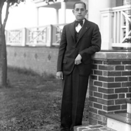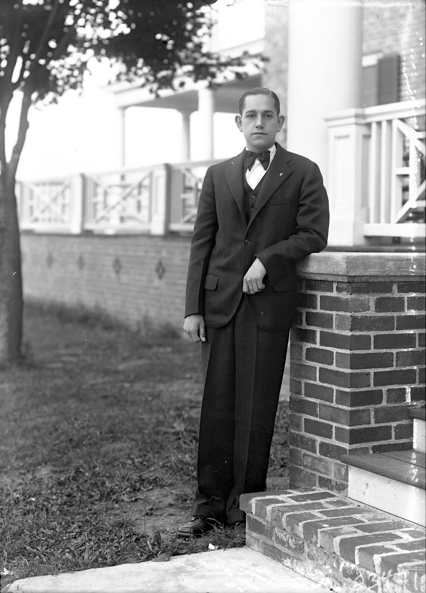 Unidentified young man is standing in front of the Shenvallee Hotel in New Market, Virginia. He is wearing a suit and bow tie.