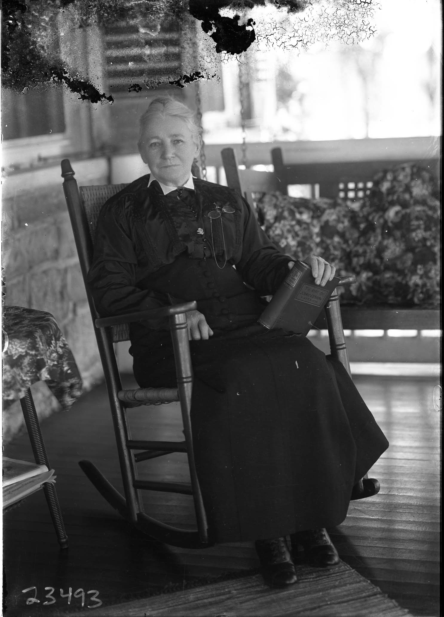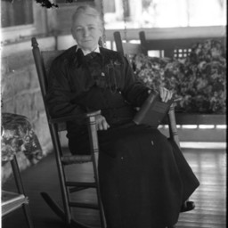 Unidentified older woman is seated on a rocking chair outdoors on a porch. She is holding a book on her lap.