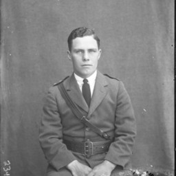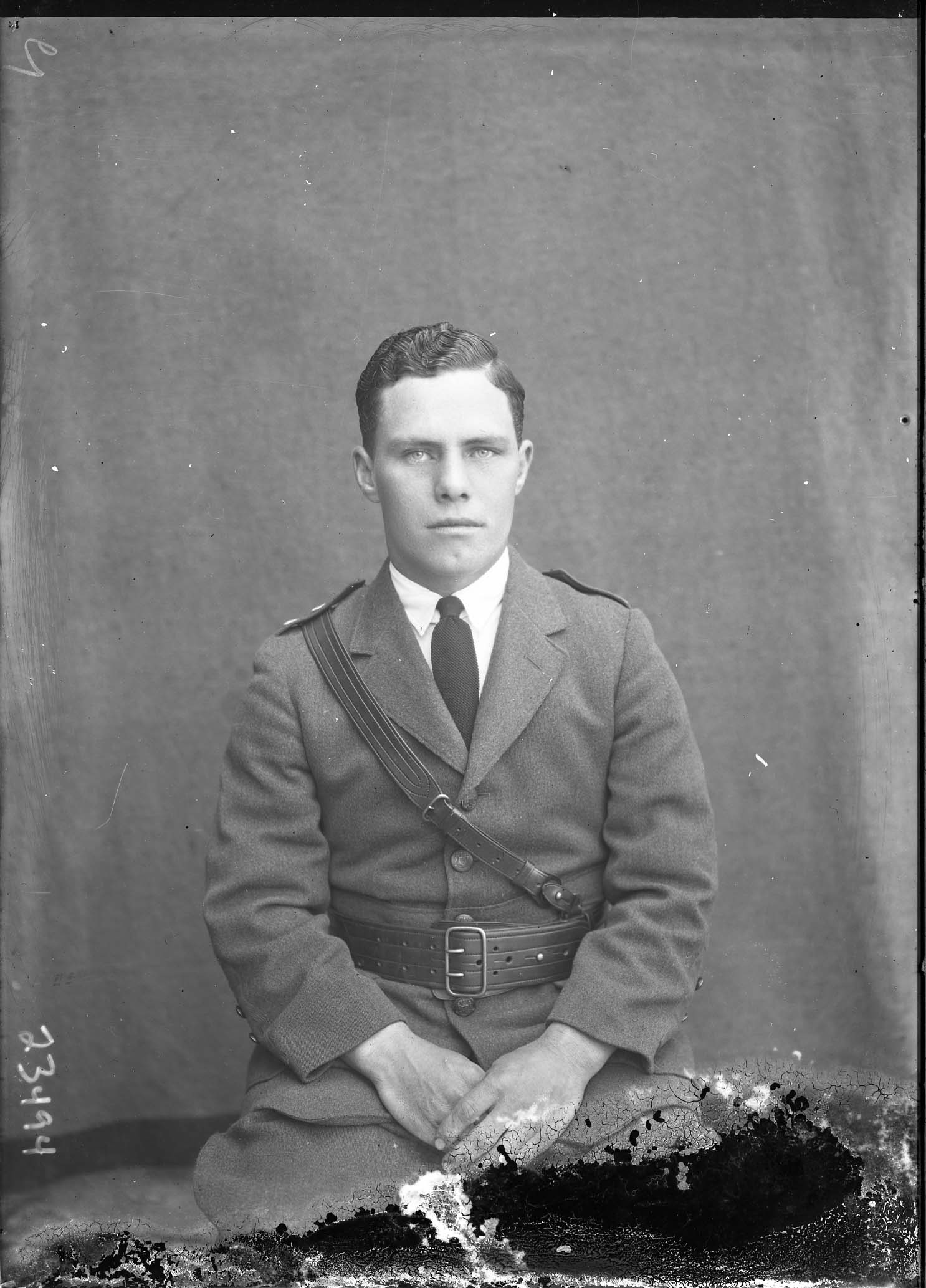 Unidentified young man is wearing a military-styled uniform replete with a Sam Brown belt.