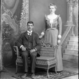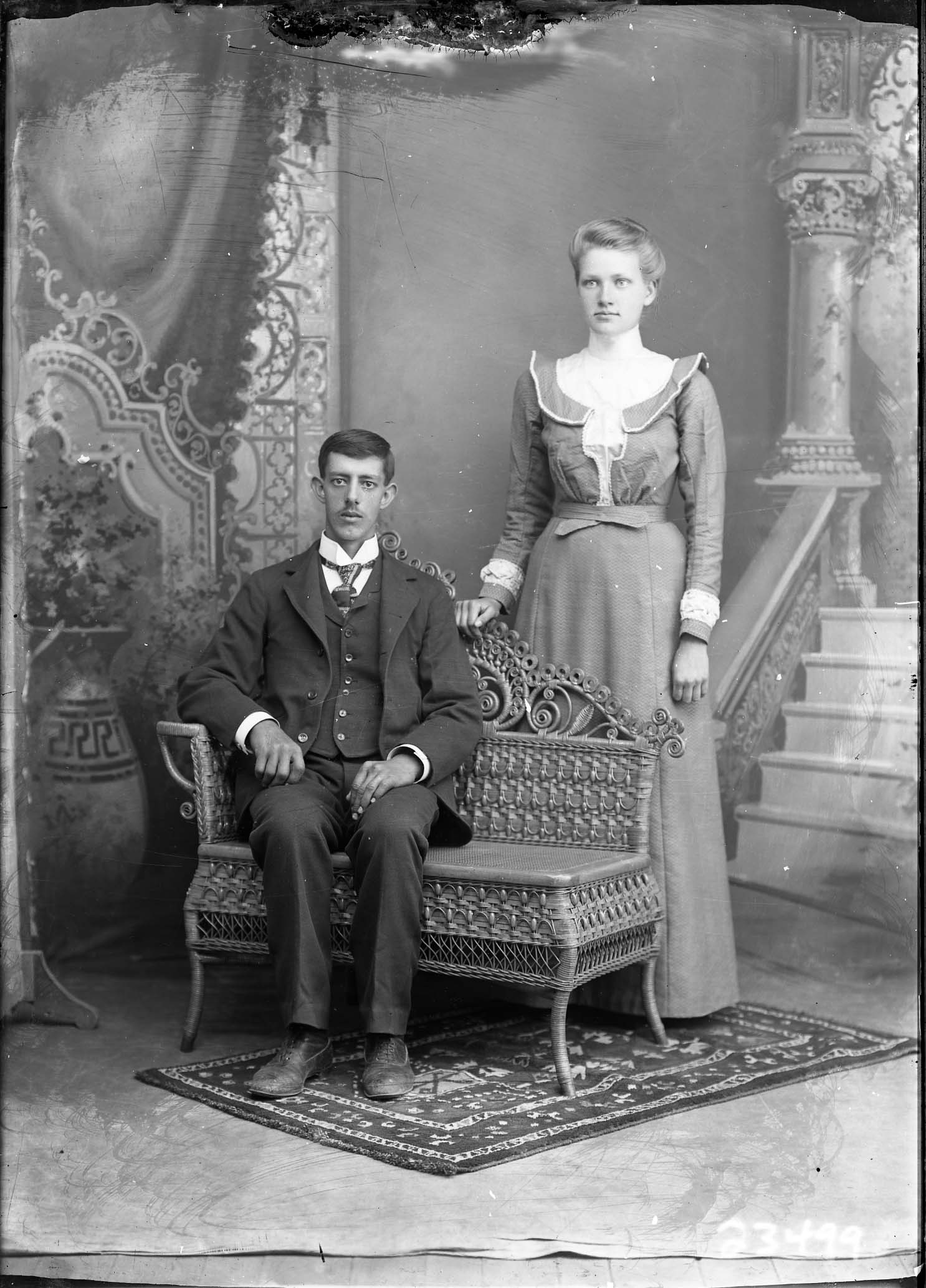 Unidentified man, seated on a wicker bench, and wearing a suit and tie with a starched and upright tie, is posed with an unidentified woman in a long dress standing behind him.