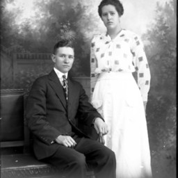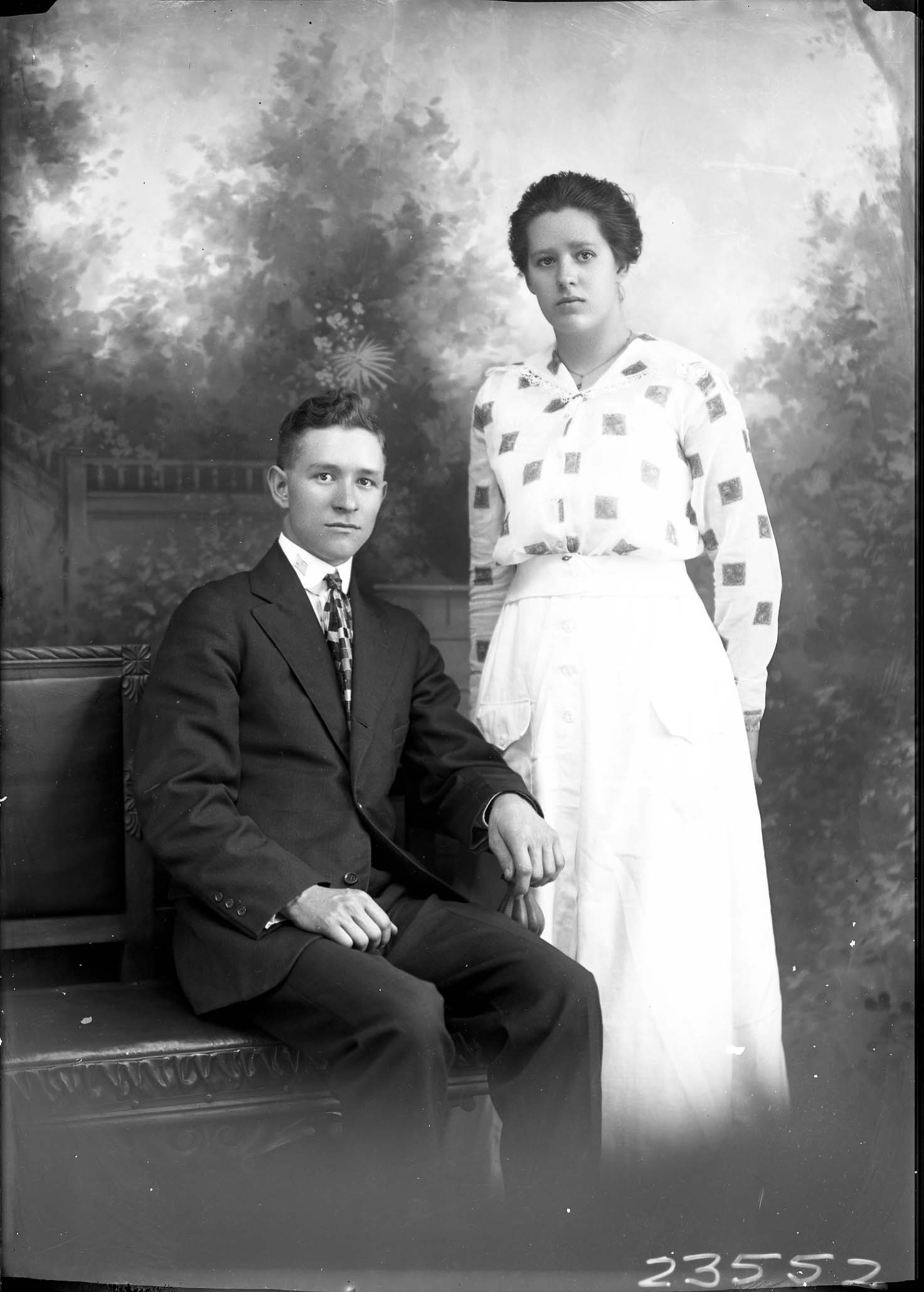 Unidentified young man, seated, is posed with an unidentified young woman in a blouse and skirt standing beside him.
