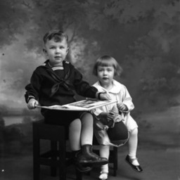 Two unidentified children, a boy and a younger child, are posed together with an open book. The older boy is wearing a sailor-themed outfit.