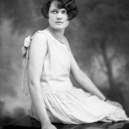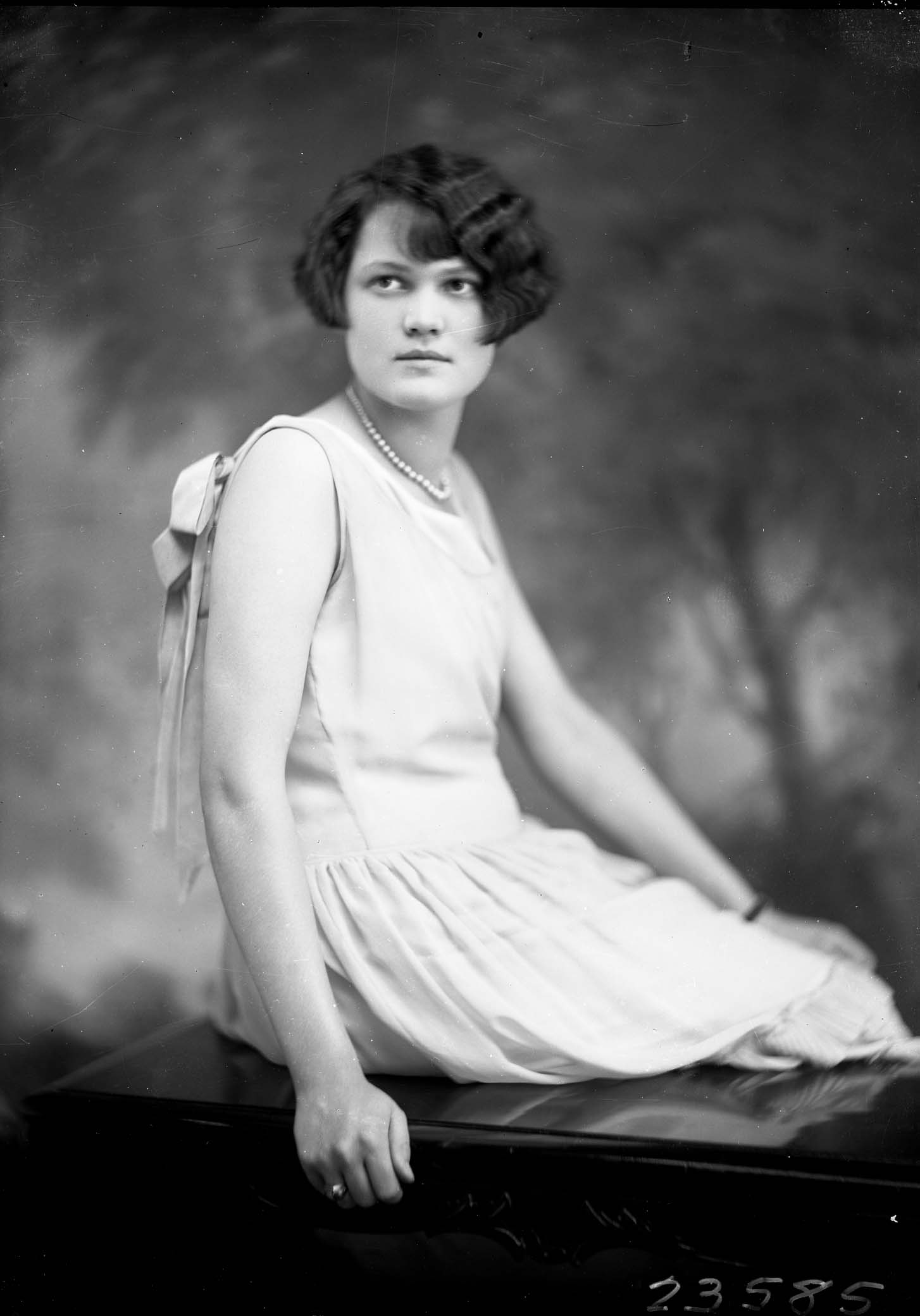 Unidentified woman with short, wavy hair is seated slightly sideways on a bench and looking back over her shoulder. She is wearing faux pearls with her sleeveless dress.