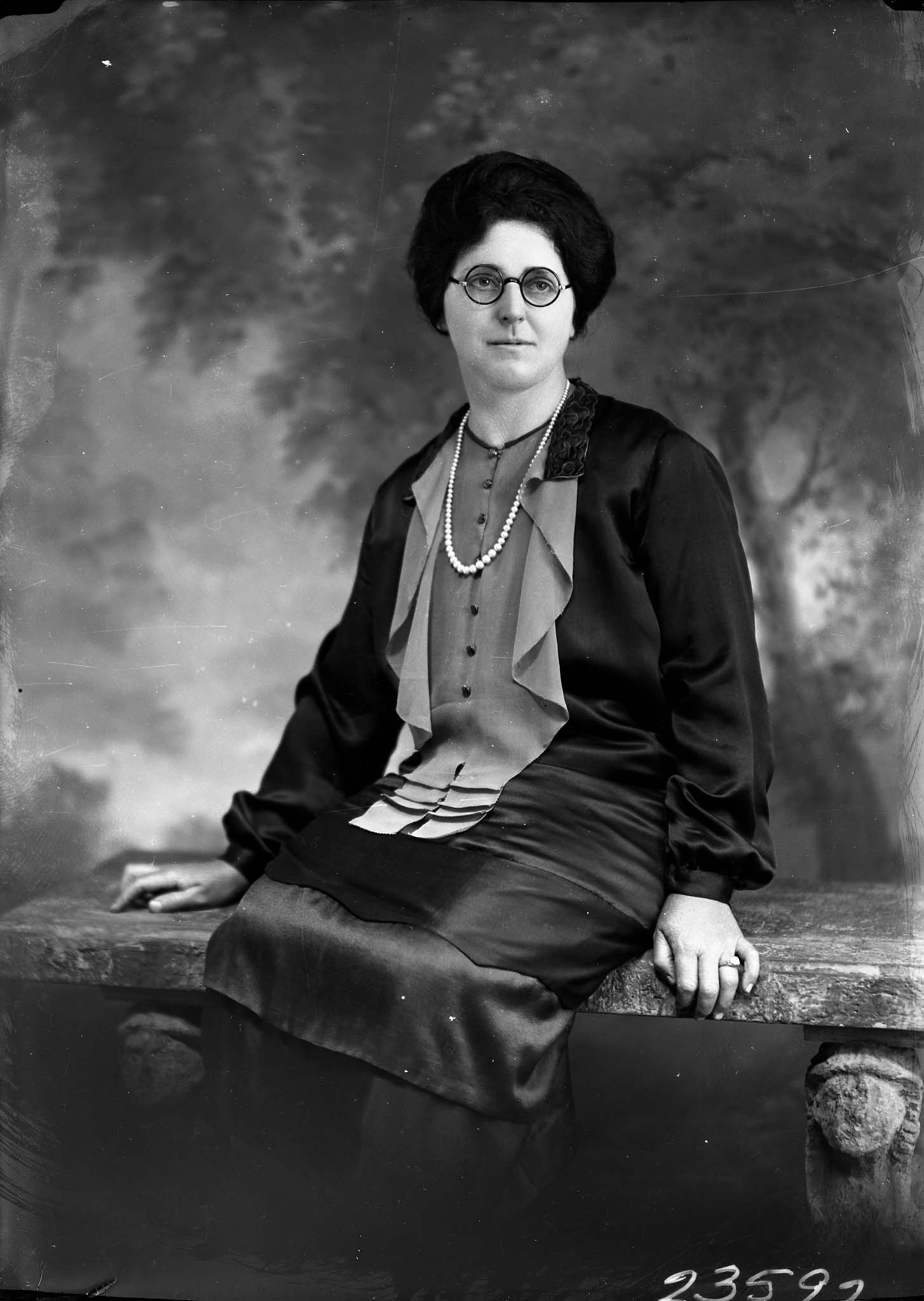 Unidentified woman with round glasses and wearing a long bead necklace, is seated on a stone bench.