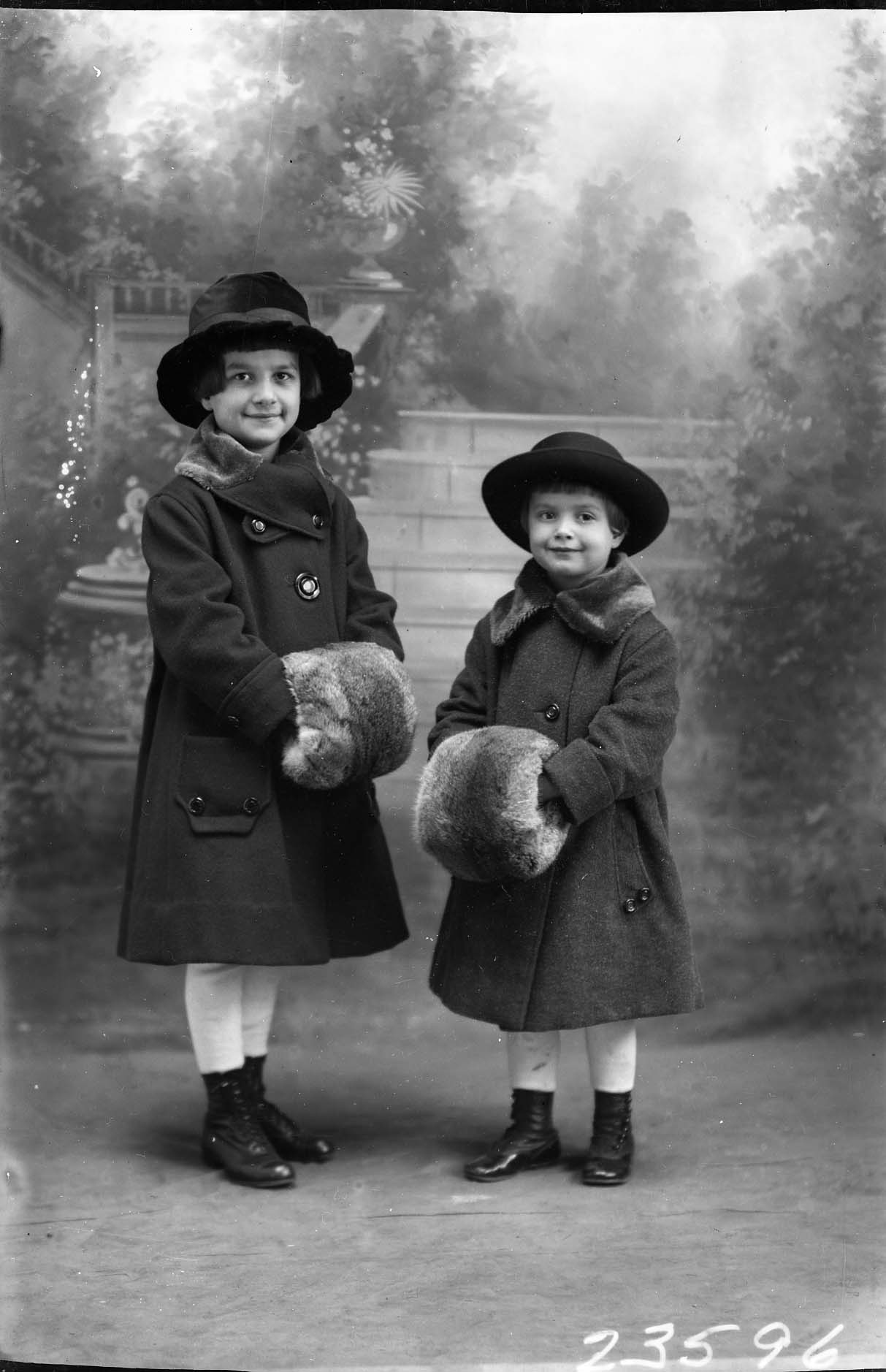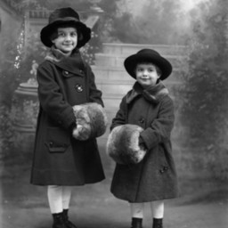 Two unidentified young girls wearing matching hats, coats, and hand muffs, are standing together.