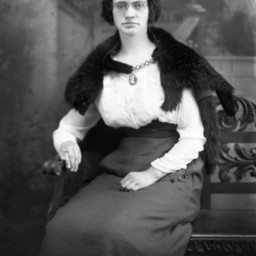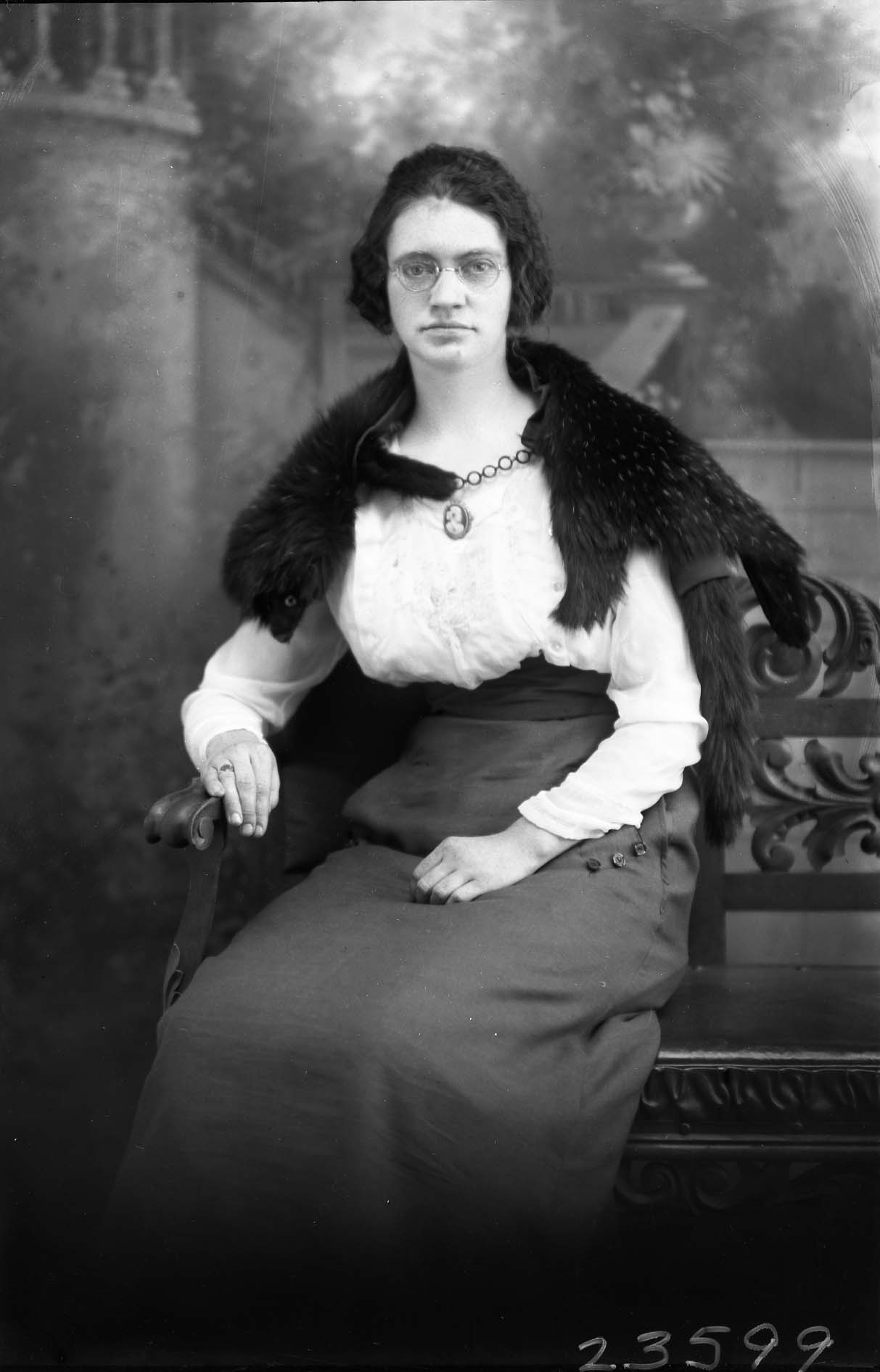 Unidentified woman with glasses is seated on a bench and wearing a fur stole around her shoulders and a cameo brooch pinned to her blouse.