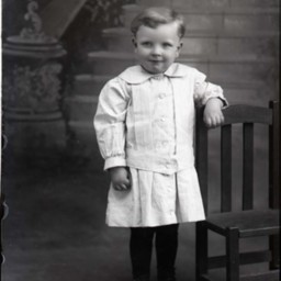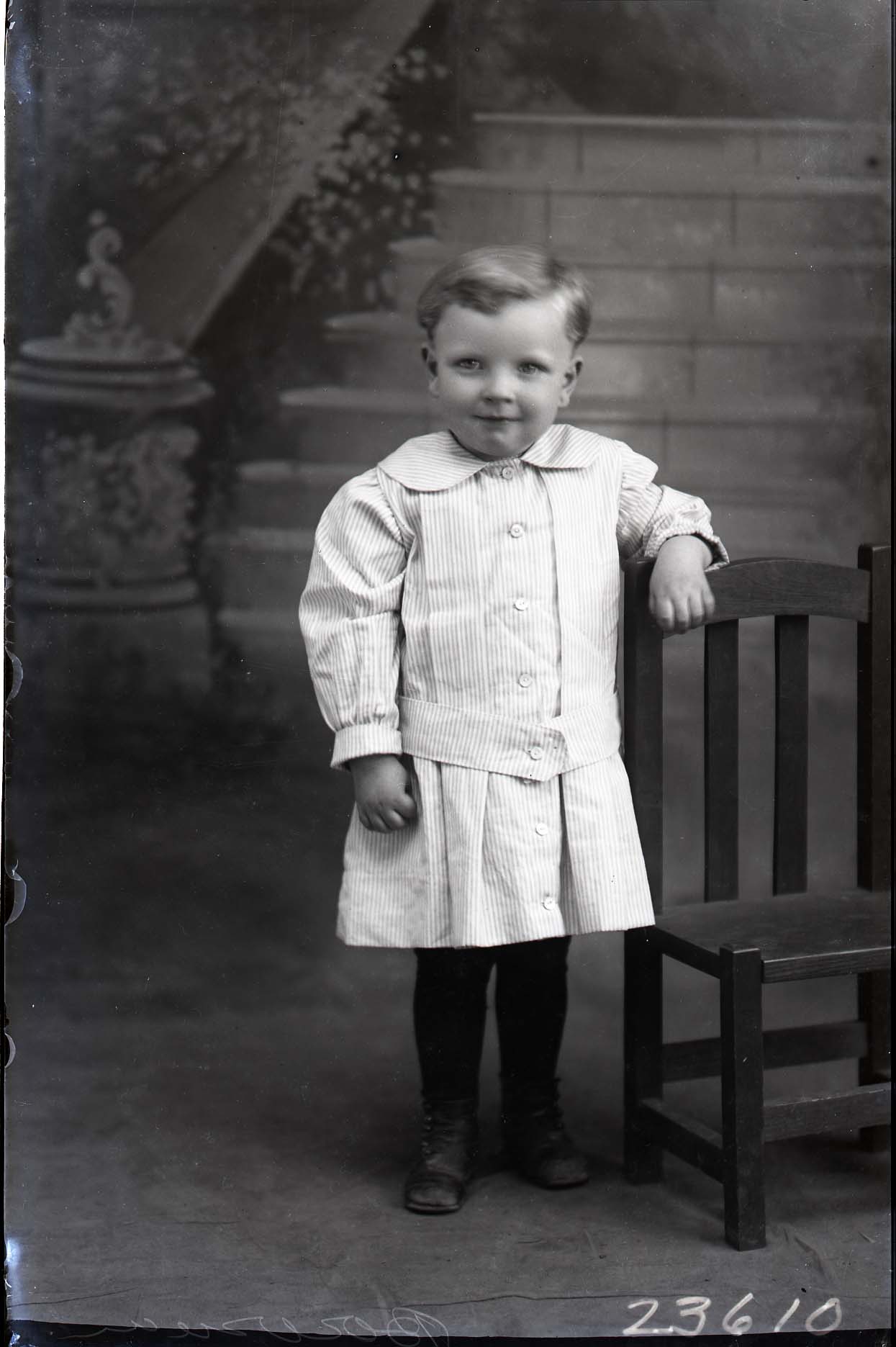 Unidentified young boy is standing beside a child-sized chair and posed with an elbow resting on the chair's back.