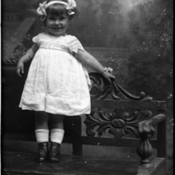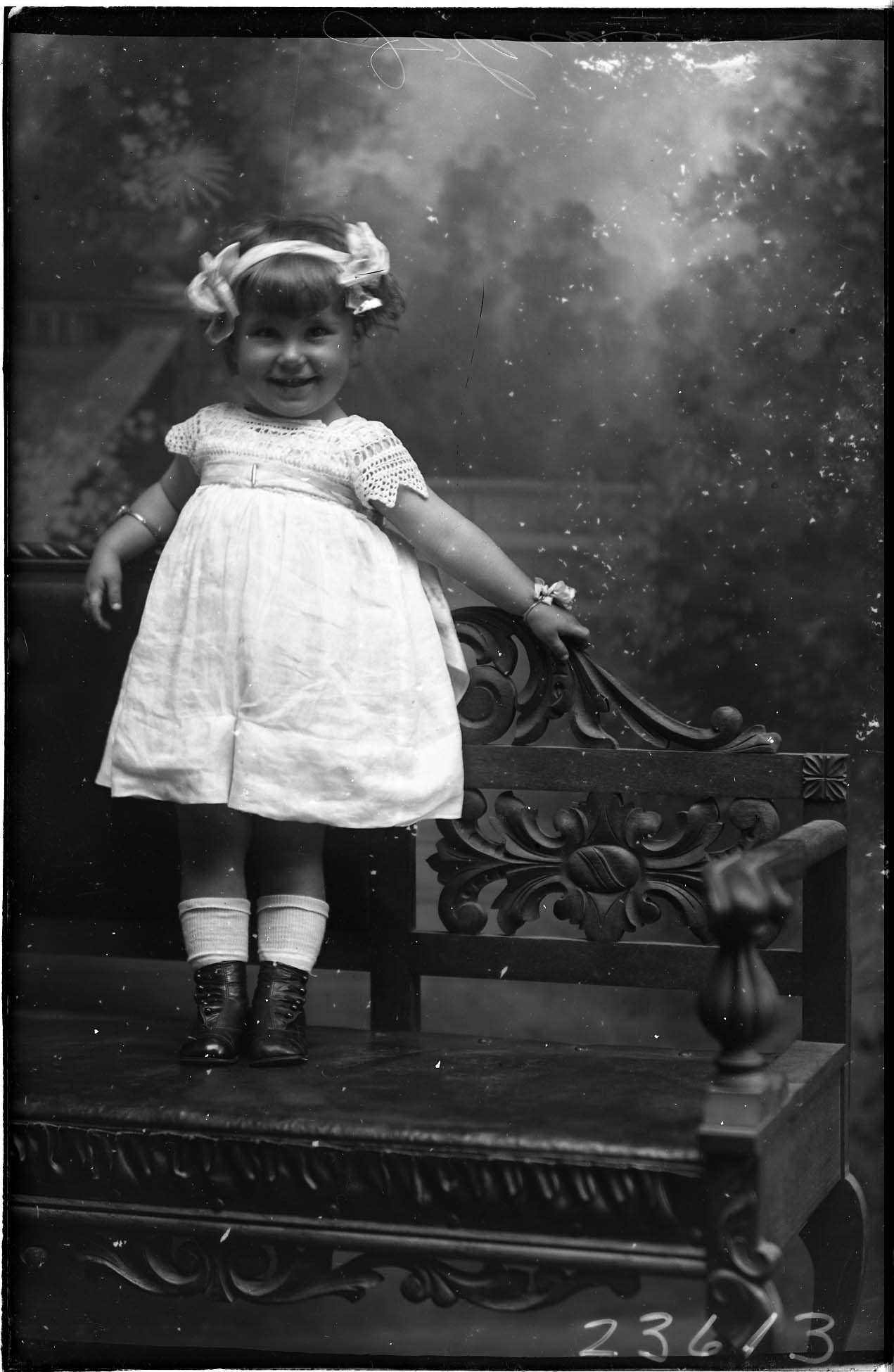 Unidentified young girl with bows on her headband, is standing on a bench.