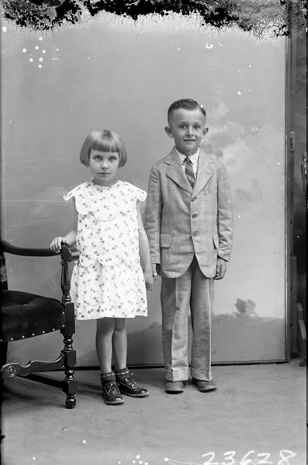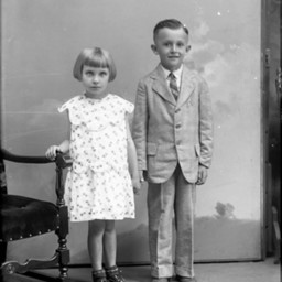 Two unidentified children, a girl with short hair and bangs and an older boy in a suit, are posed together.