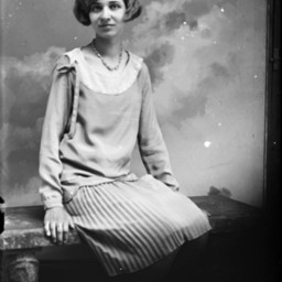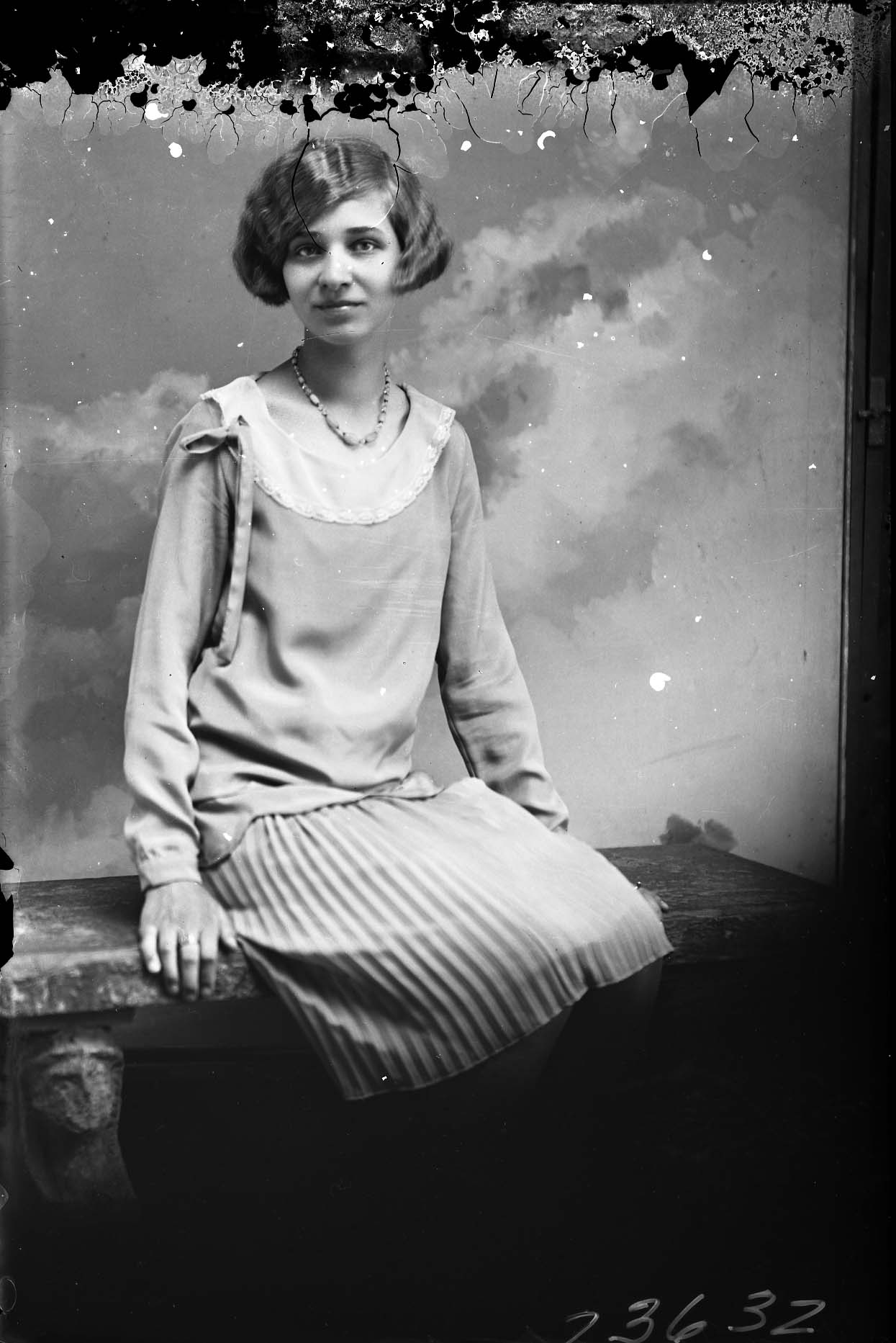 Unidentified young woman with short hair and wearing a necklace with her dress, is seated on a stone bench.