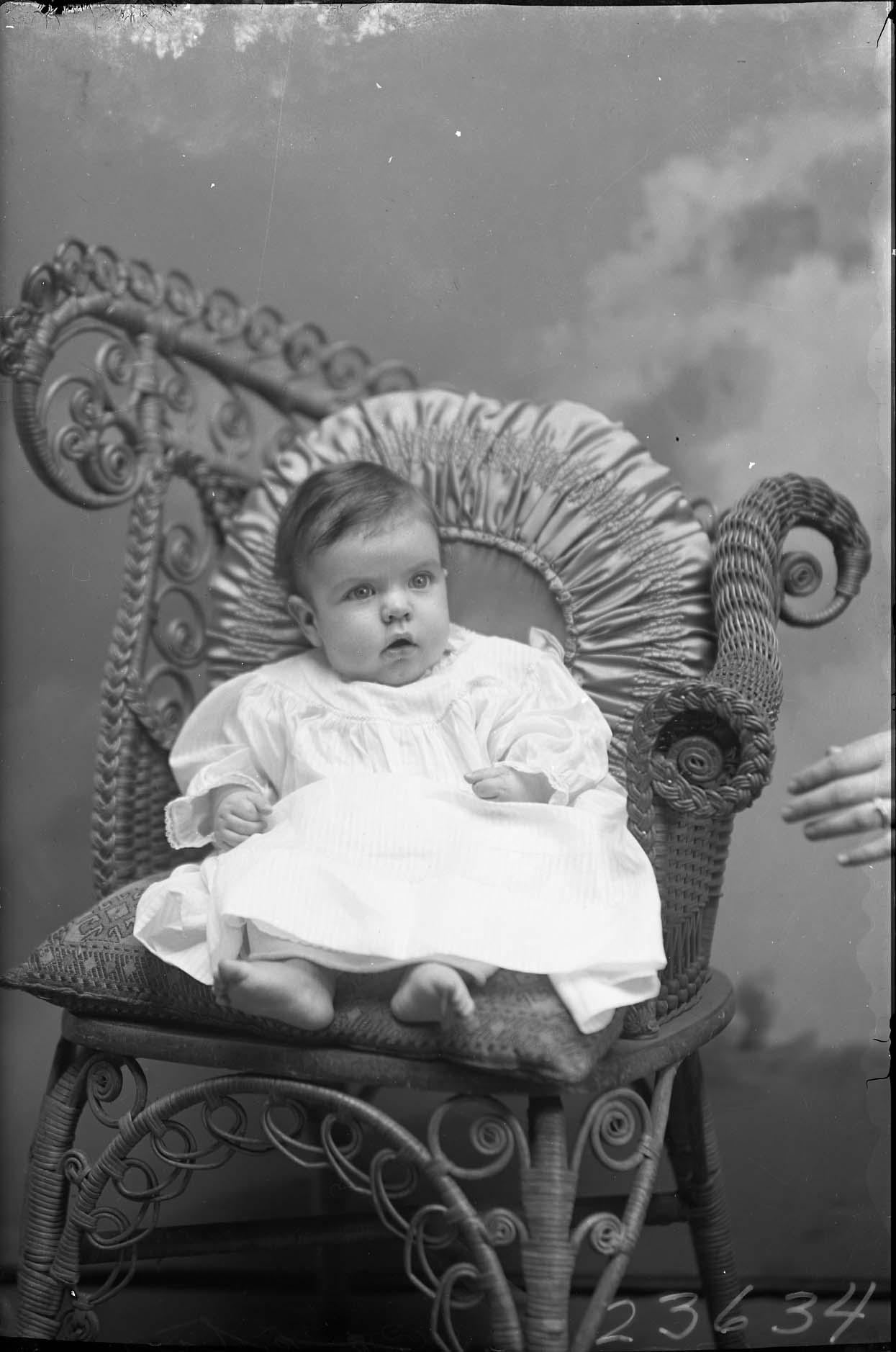 Unidentified barefoot baby is propped against a pillow on a wicker chair.