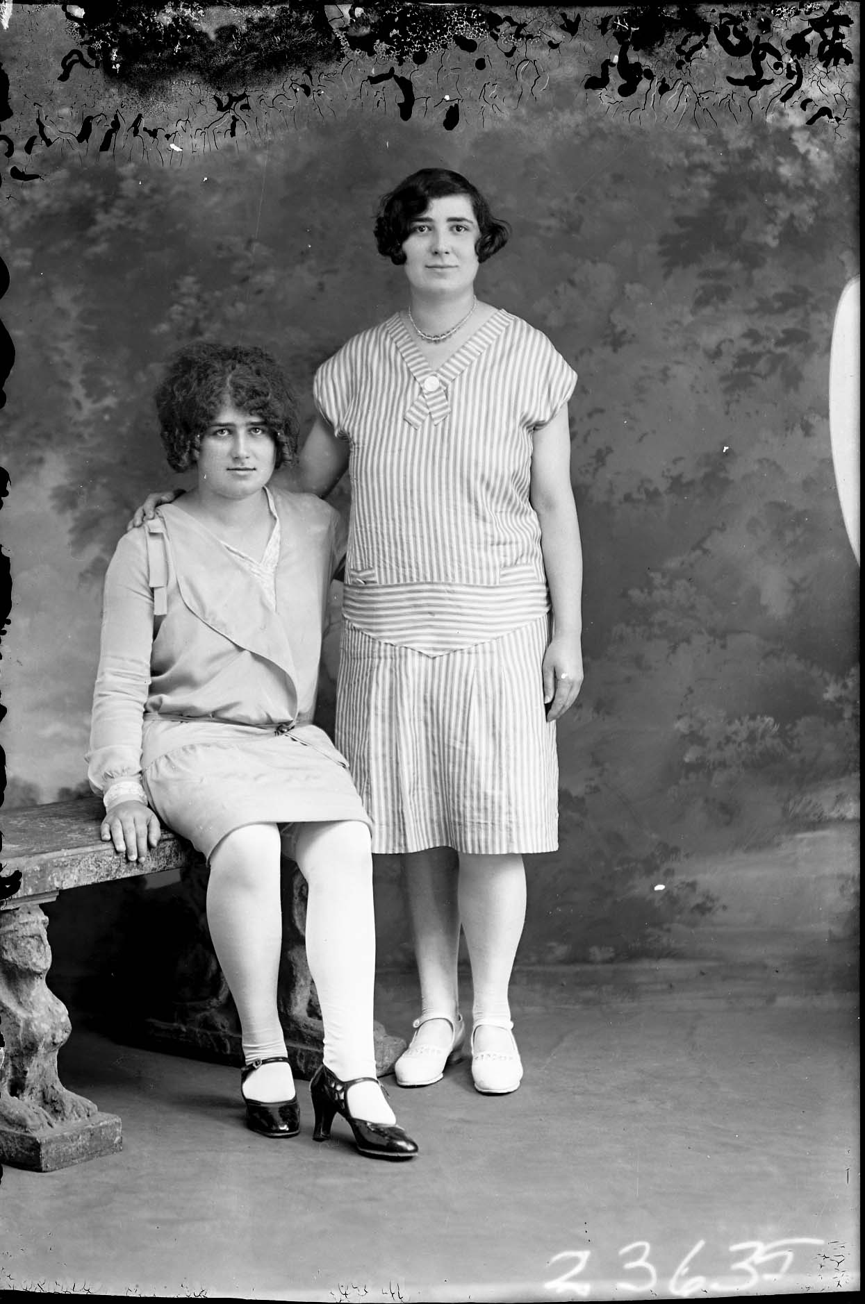Two unidentified women, one seated and one standing, are posed together.