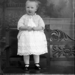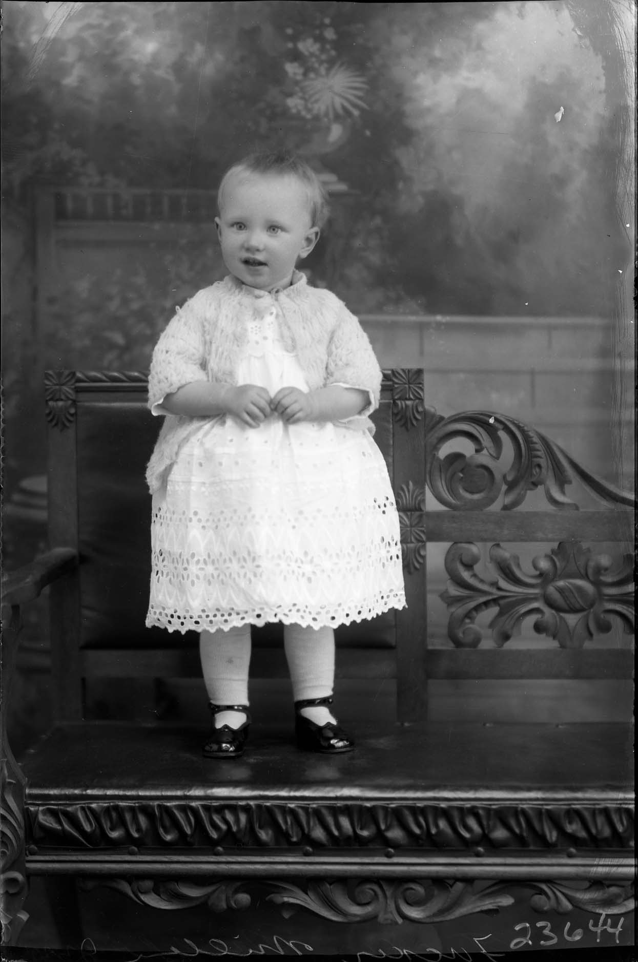 Unidentified young child is standing on a bench and wearing a knit sweater over her dress.