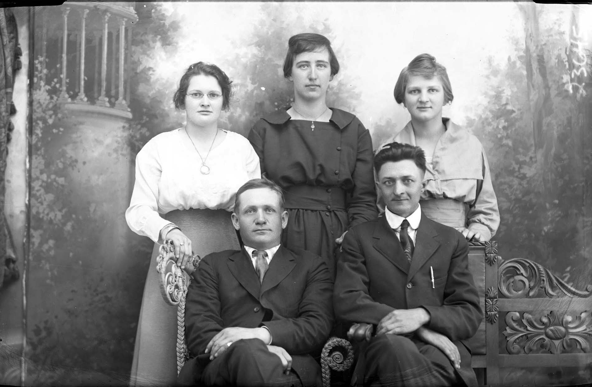 Unidentified man in a suit and tie is seated beside a younger unidentified man. Three unidentified young women are standing behind them.