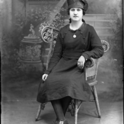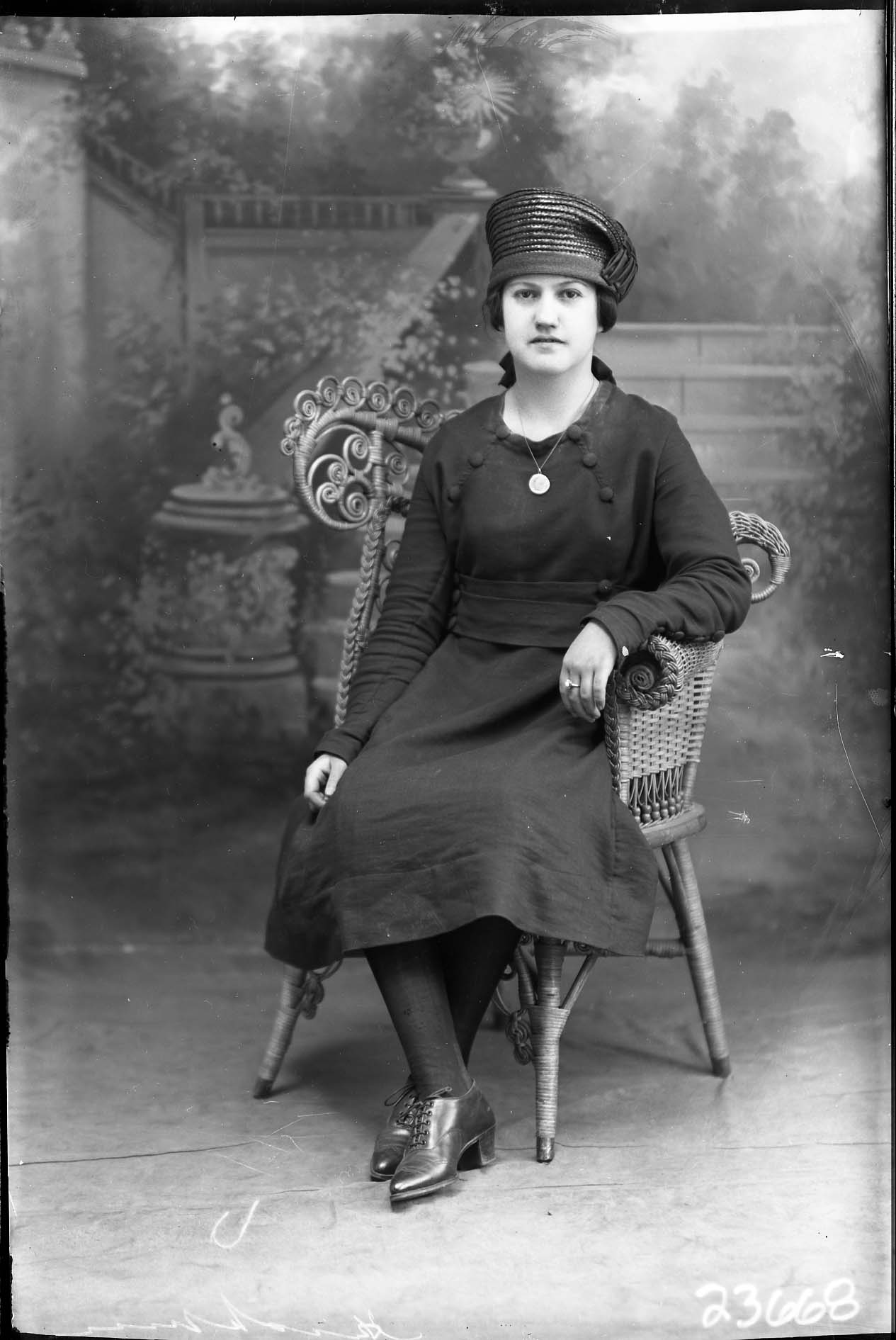Unidentified woman in a hat and necklace is seated on a wicker chair with an arm resting on the chair's arm.
