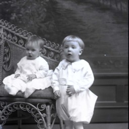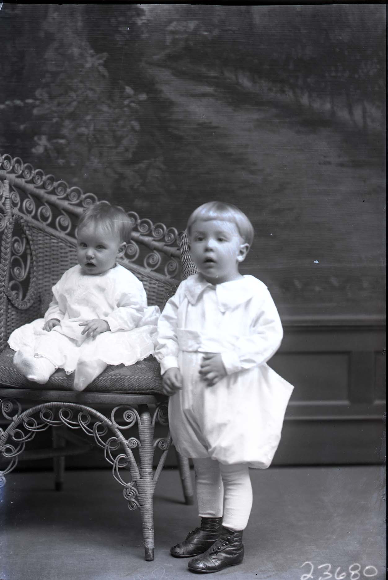 Two unidentified young children, a toddler on a wicker chair and an older blond boy, are posed together.