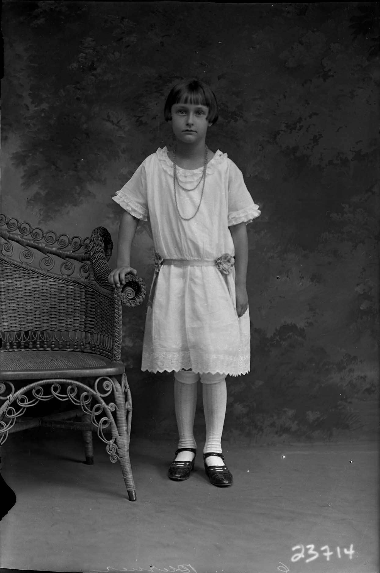 Unidentified girl with short hair and bangs is standing by a wicker chair.