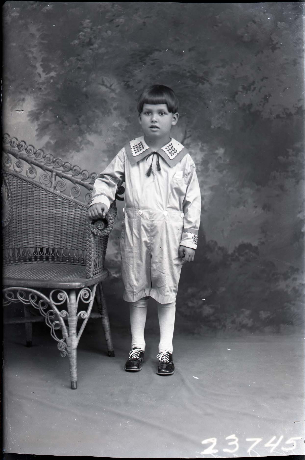 Unidentified young boy is standing by a wicker chair and wearing an outfit with a small bow tied under his collar.