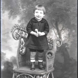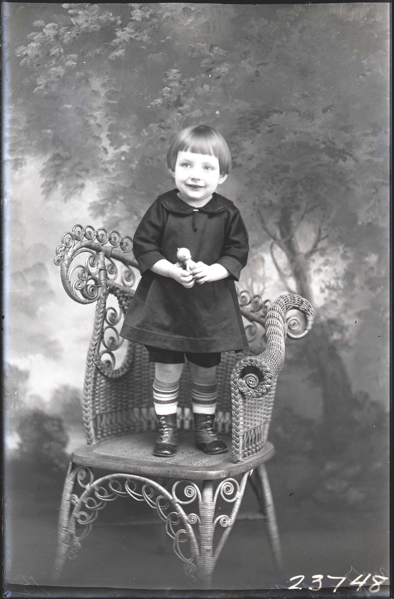 Unidentified young child with bangs, is standing on a wicker chair and holding a toy in his hands.