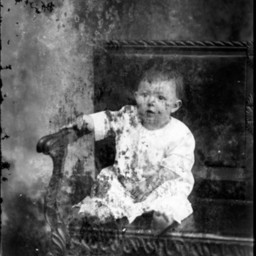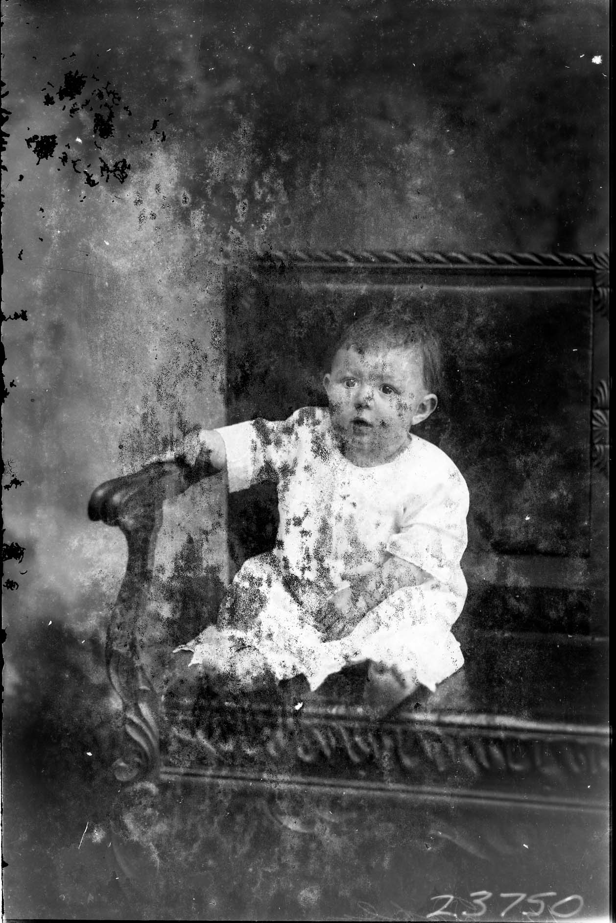 Damaged image of an unidentified barefoot young child seated on a bench.