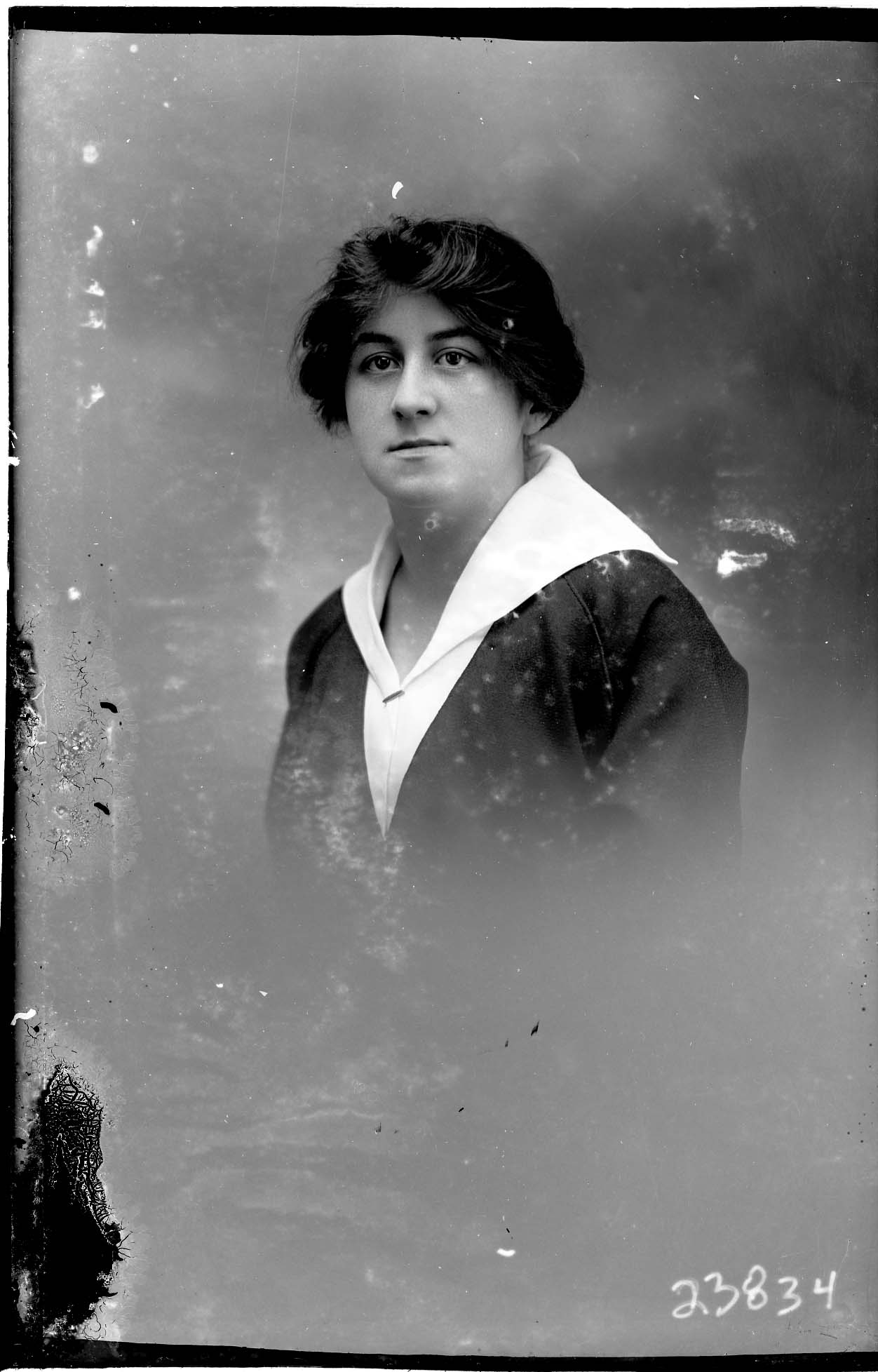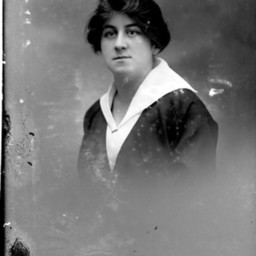 Portrait photograph of an unidentified woman with her hair pulled back and wearing a dress with a white collar.