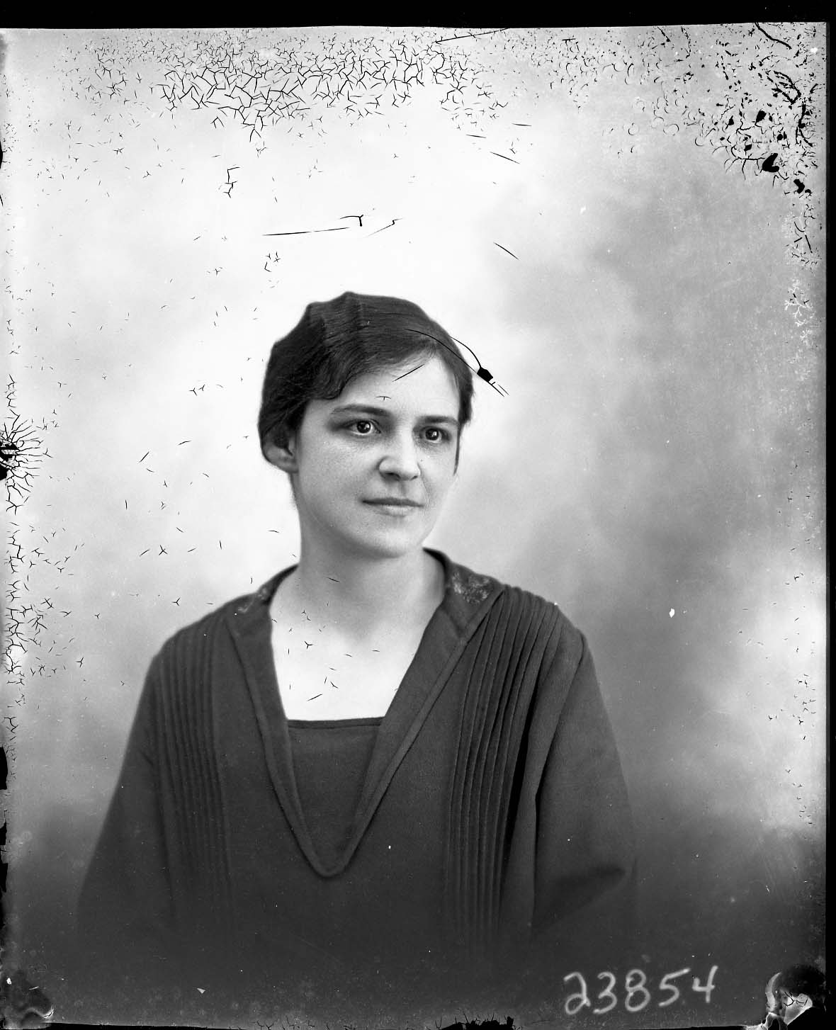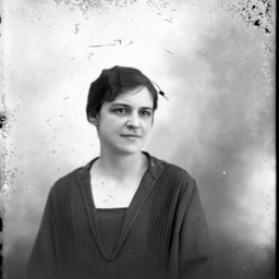 Portrait photograph of an unidentified woman with her hair pulled back and wearing a long-sleeved outfit.