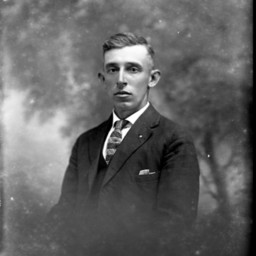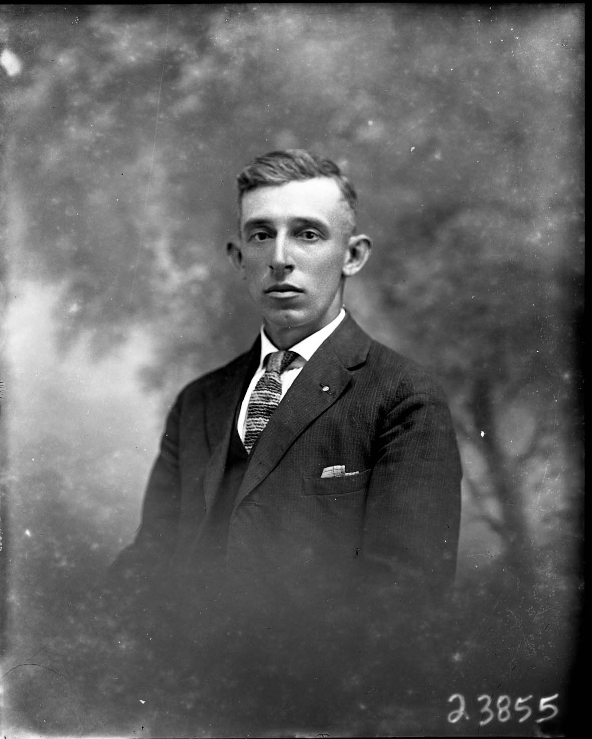 Portrait photograph of an unidentified young man wearing a suit and striped tie. Part of a handkerchief is visible in his breast pocket.