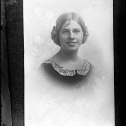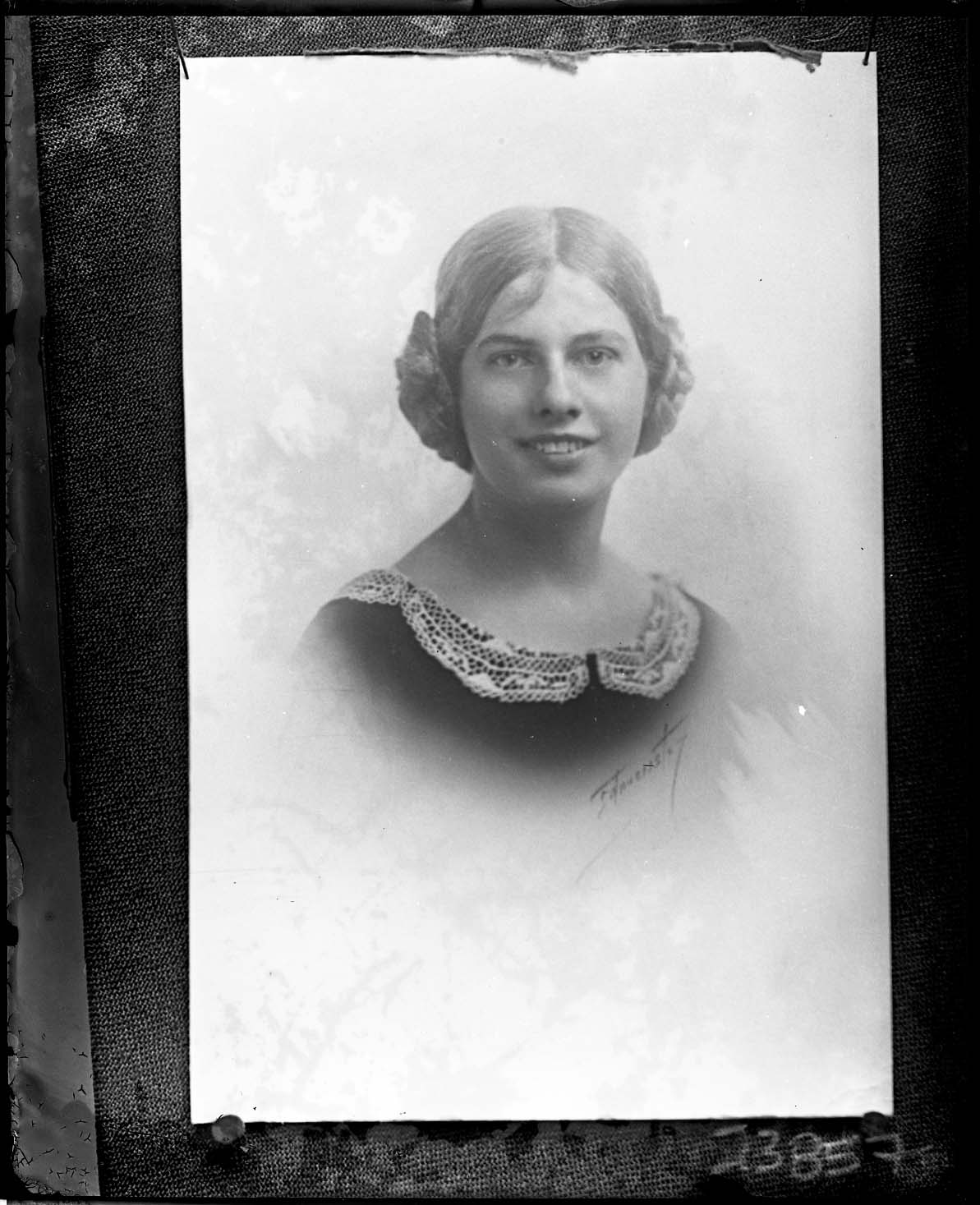 Photo of a portrait photograph of an unidentified woman with her hair parted in the middle and wearing a dress with a lace collar.