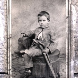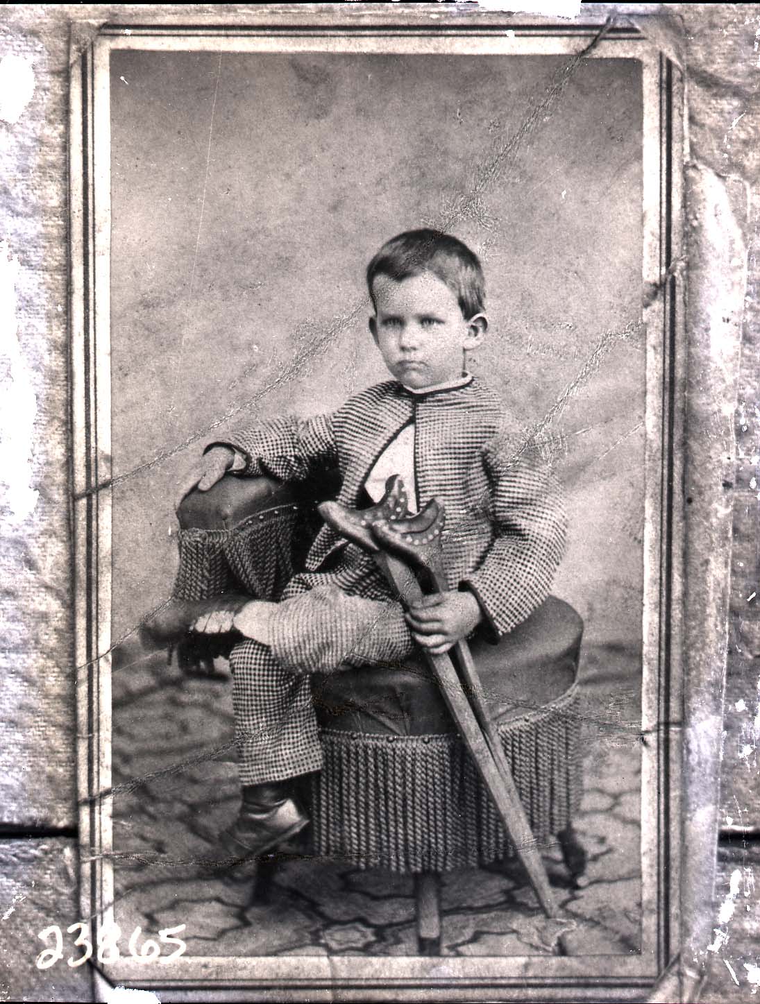 Photo of an older photograph of an unidentified boy seated on a chair with one leg resting on the knee of the other. He is holding a pair of crutches in one hand.