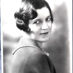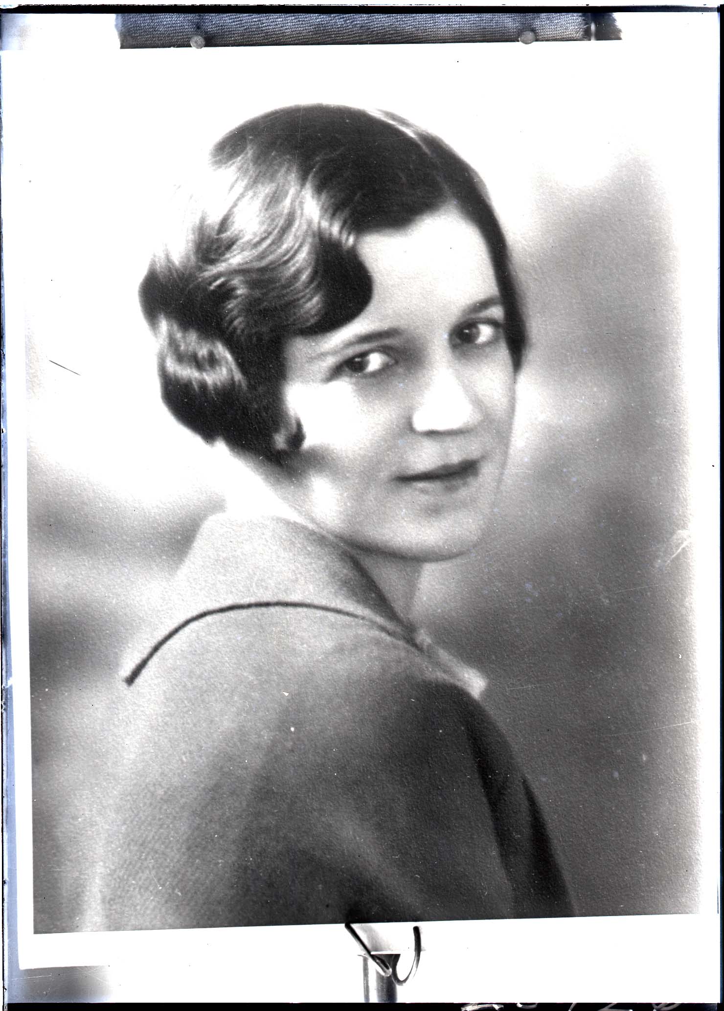 Photo of a portrait photograph of an unidentified woman with short, wavy hair and posed looking over her shoulder at the camera.