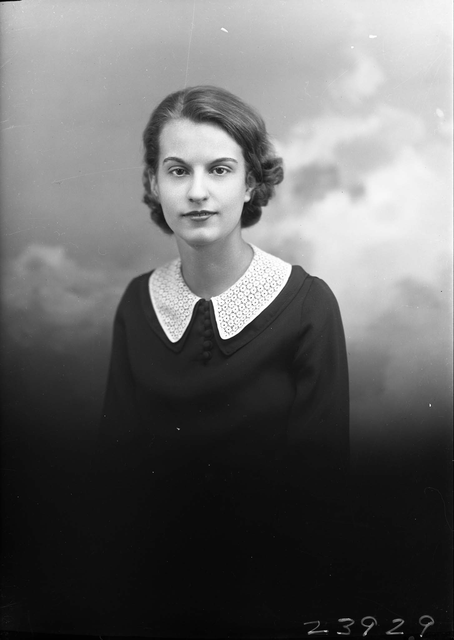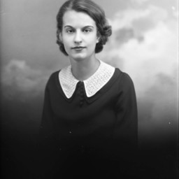 Portrait photograph of an unidentified woman with short hair and wearing a white collar with her dark-colored dress.