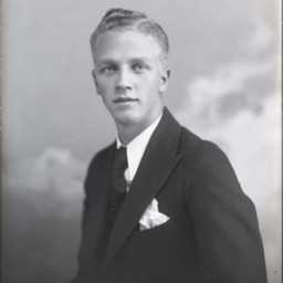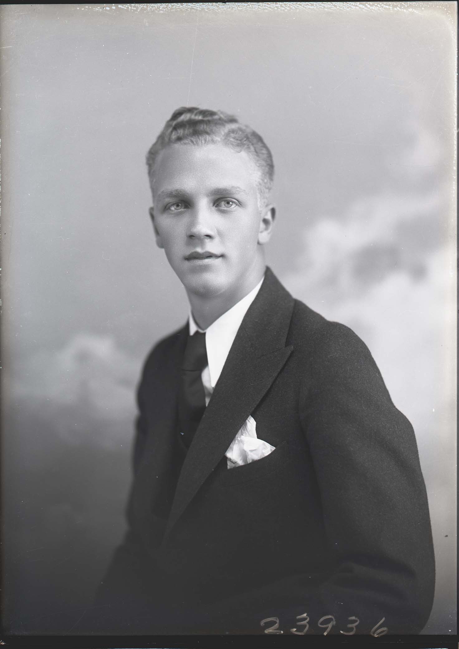 Portrait photograph of an unidentified young man wearing a suit and tie with a handkerchief in his breast pocket.
